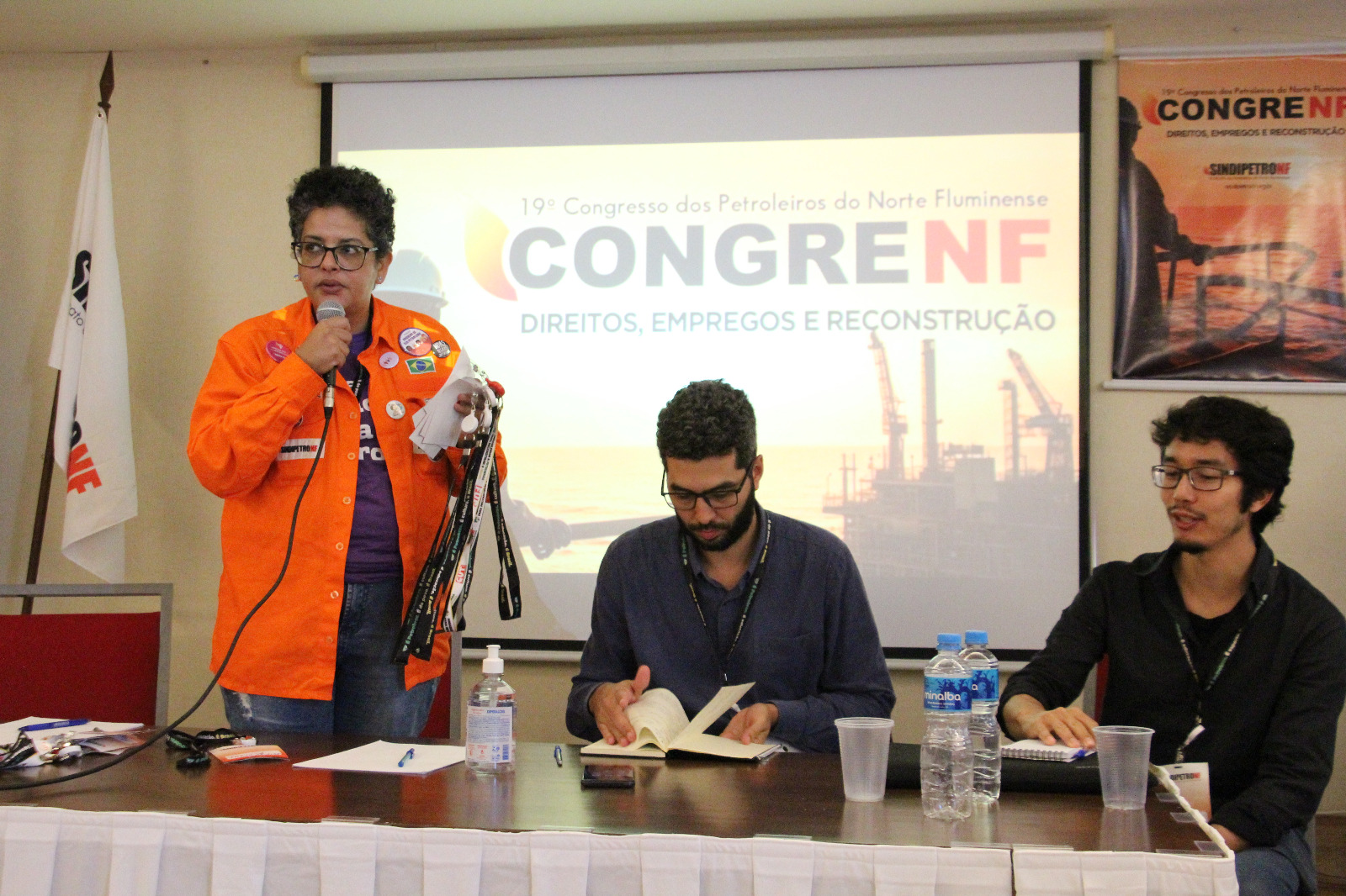 Mesa de debate nesta manhã, durante o 19° Congrenf (Congresso dos Petroleiros e das Petroleiras do Norte Fluminense), traçou um diagnóstico da indústria do petróleo na região e apontou tendências de impactos sobre os trabalhadores e a economia dos municípios. Fizeram exposições o sociólogo José Luiz Viana (UFF) e os economistas Carlos Takashi (Dieese) e Mahatma Ramos (Diretor técnico do Ineep), em interação moderada pela diretora do Sindipetro-NF, Jancileide Morgado.