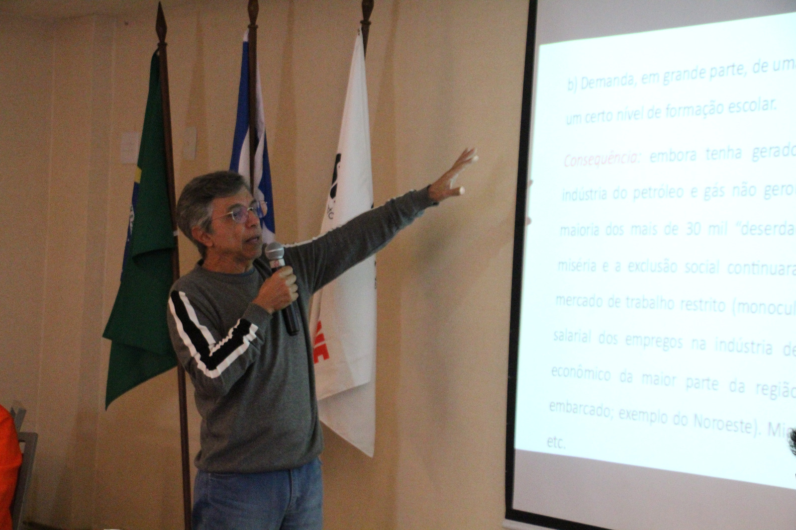 O professor José Luiz Viana fez uma panorâmica dos impactos da presença da indústria de petróleo e gás na região. O pesquisador identifica que a chegada da Petrobrás, na década de 70, não conseguiu absorver a mão de obra excedente, especialmente aquela formada pelos trabalhadores do corte de cana.