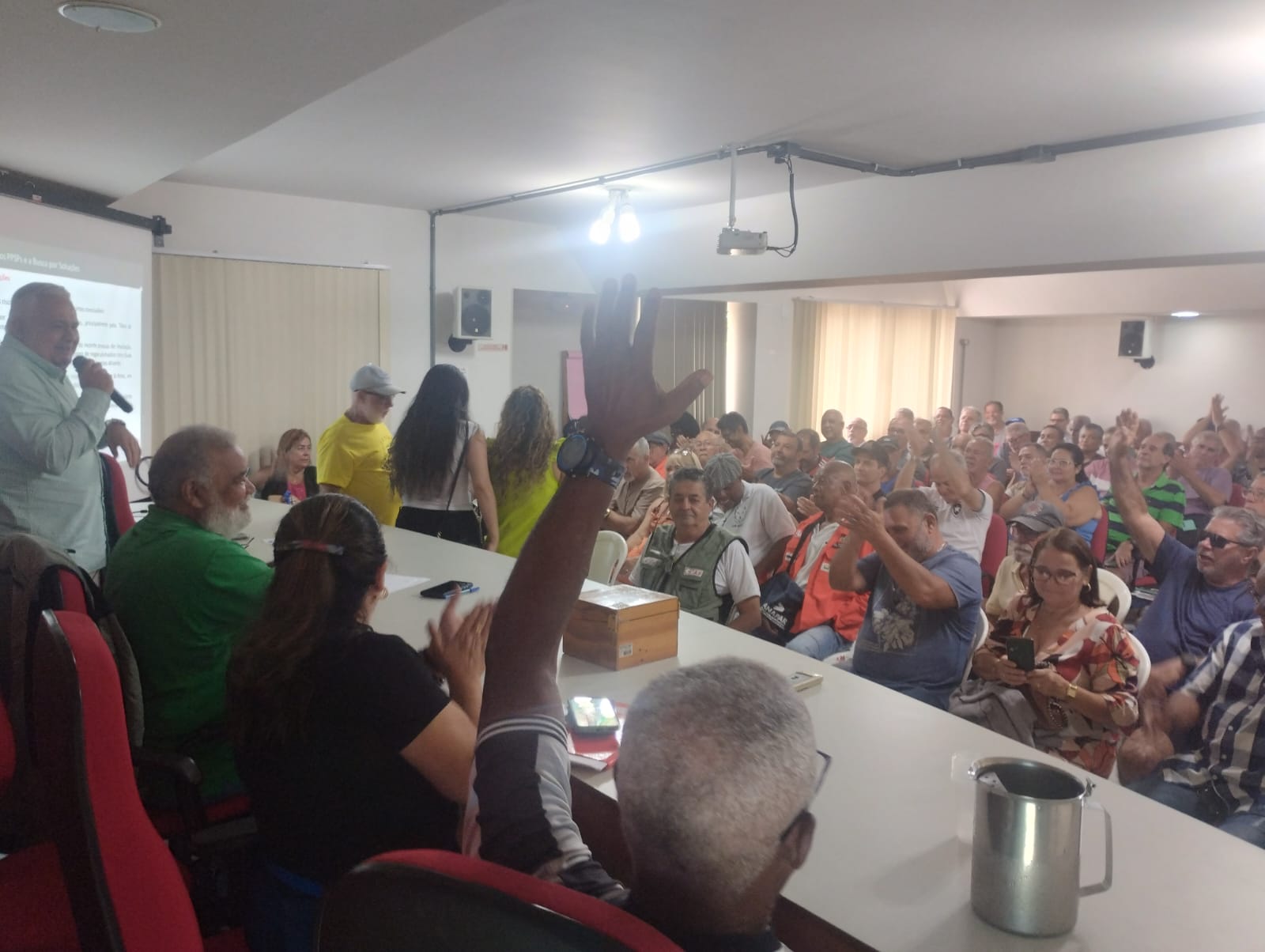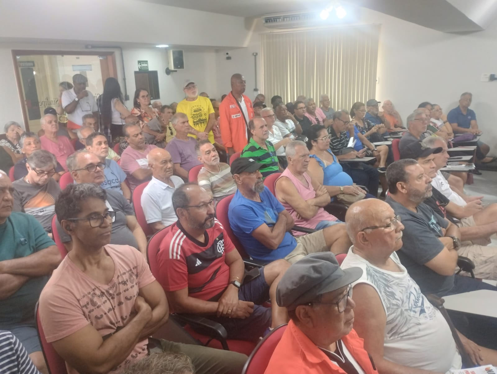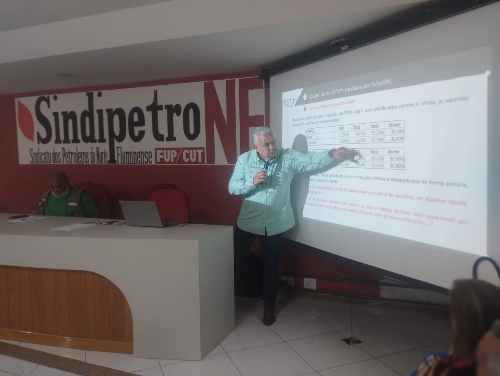 Aposentados, aposentadas e pensionistas lotam o auditório do Sindipetro-NF, na sede de Campos dos Goytacazes, nesta manhã, para apresentação do especialista atuarial Luiz Felipe, que aborda questões importantes relacionadas à Petros, oferecendo esclarecimentos e orientações.