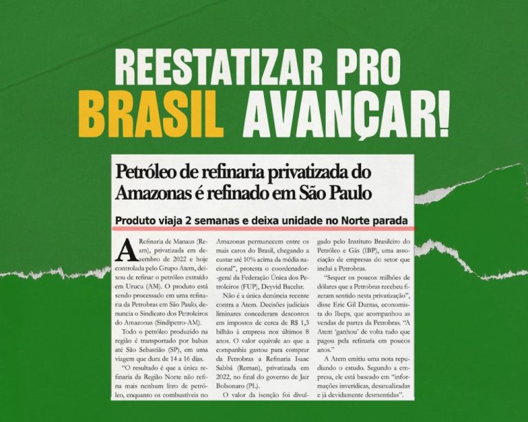 “O resultado é que a única refinaria da Região Norte não refina mais nenhum litro de petróleo, enquanto os combustíveis no Amazonas permanecem entre os mais caros do Brasil, chegando a custar até 10% acima da média nacional. A situação ameaça a viabilidade da base de Urucu, aumenta custos logísticos para a Petrobrás e penaliza diretamente os consumidores da região, que pagam mais caro por gasolina e gás de cozinha apesar de viverem em um estado produtor de petróleo”, destaca o coordenador-geral da FUP, Deyvid Bacelar.