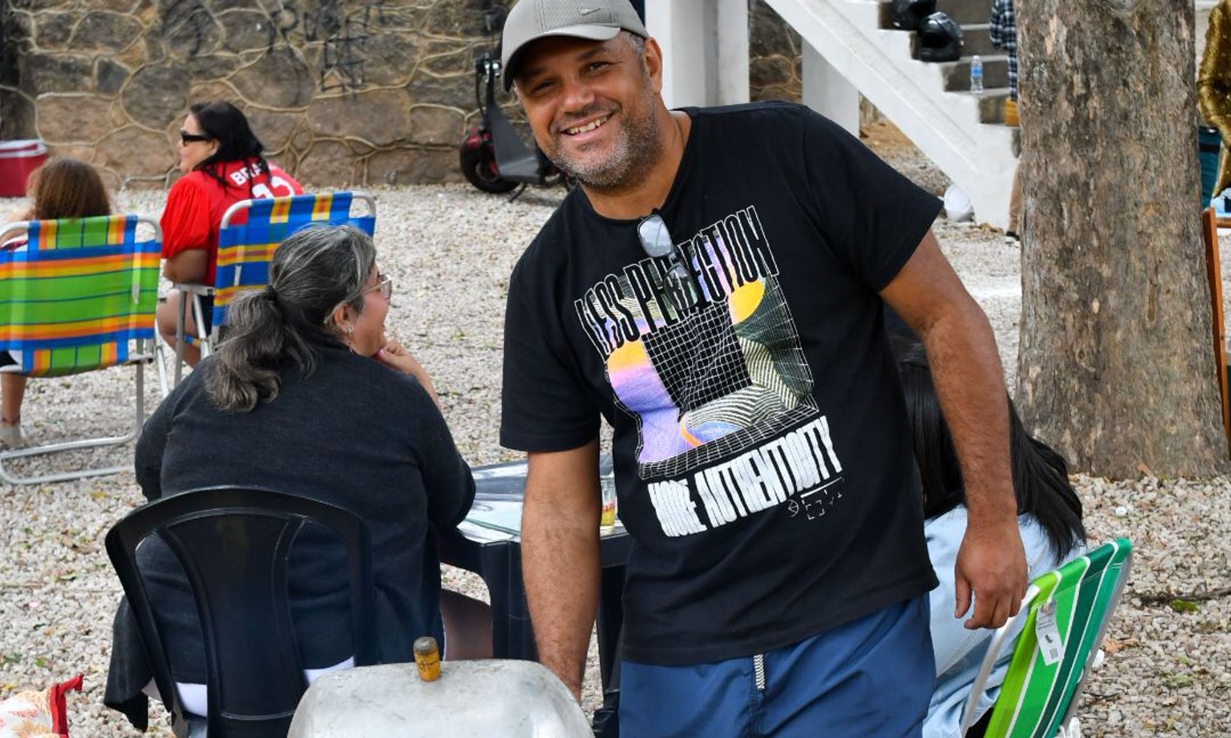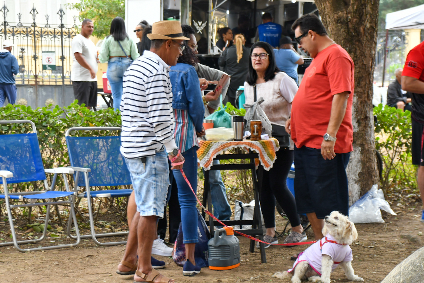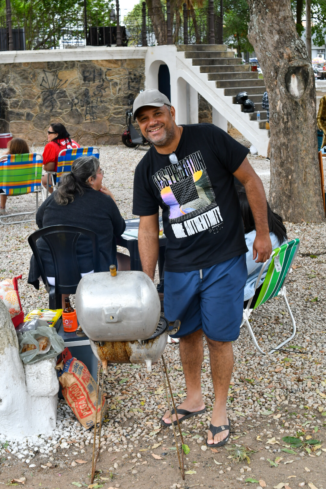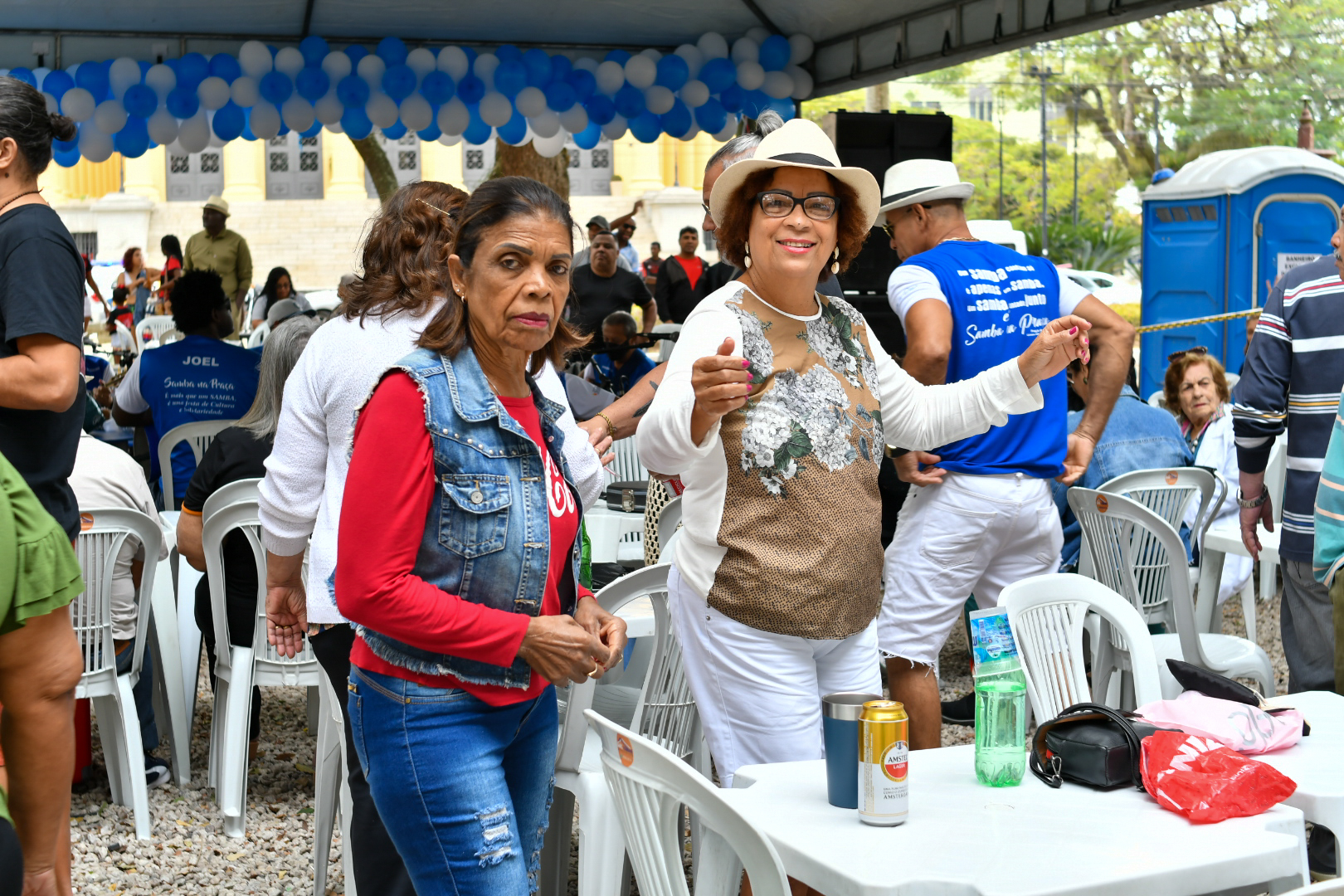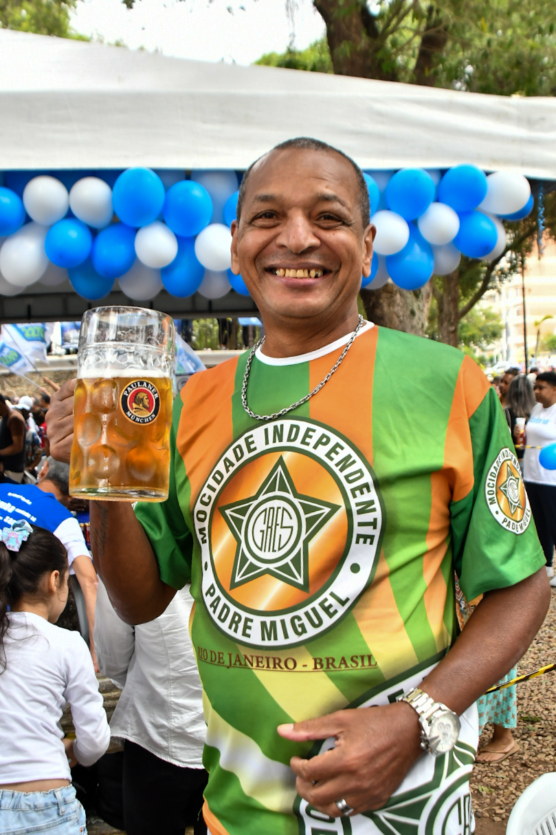 Mas a praça é democrática e quem não quiser comprar no local também pode levar de casa. É o que preferem fazer Carlos Vitor Silva, 43 anos, e a esposa Jane Viana de Sá, 42 anos, com a filha Caroline Viana Silva, 24 anos, e a amiga Kedna Barreto, 37. Eles chegaram cedo, posicionaram mesa, cadeiras, cooler e churrasqueira, e fizeram a própria área vip para curtir o samba de camarote. Pela primeira vez no evento, eles consideram que o projeto traz uma alternativa cultural e de lazer “que nem sempre está acessível às famílias”. “Acho ótimo, música boa é atemporal. É bom para todas as gerações”, celebra Carlos Vitor.