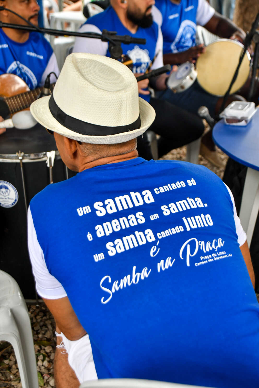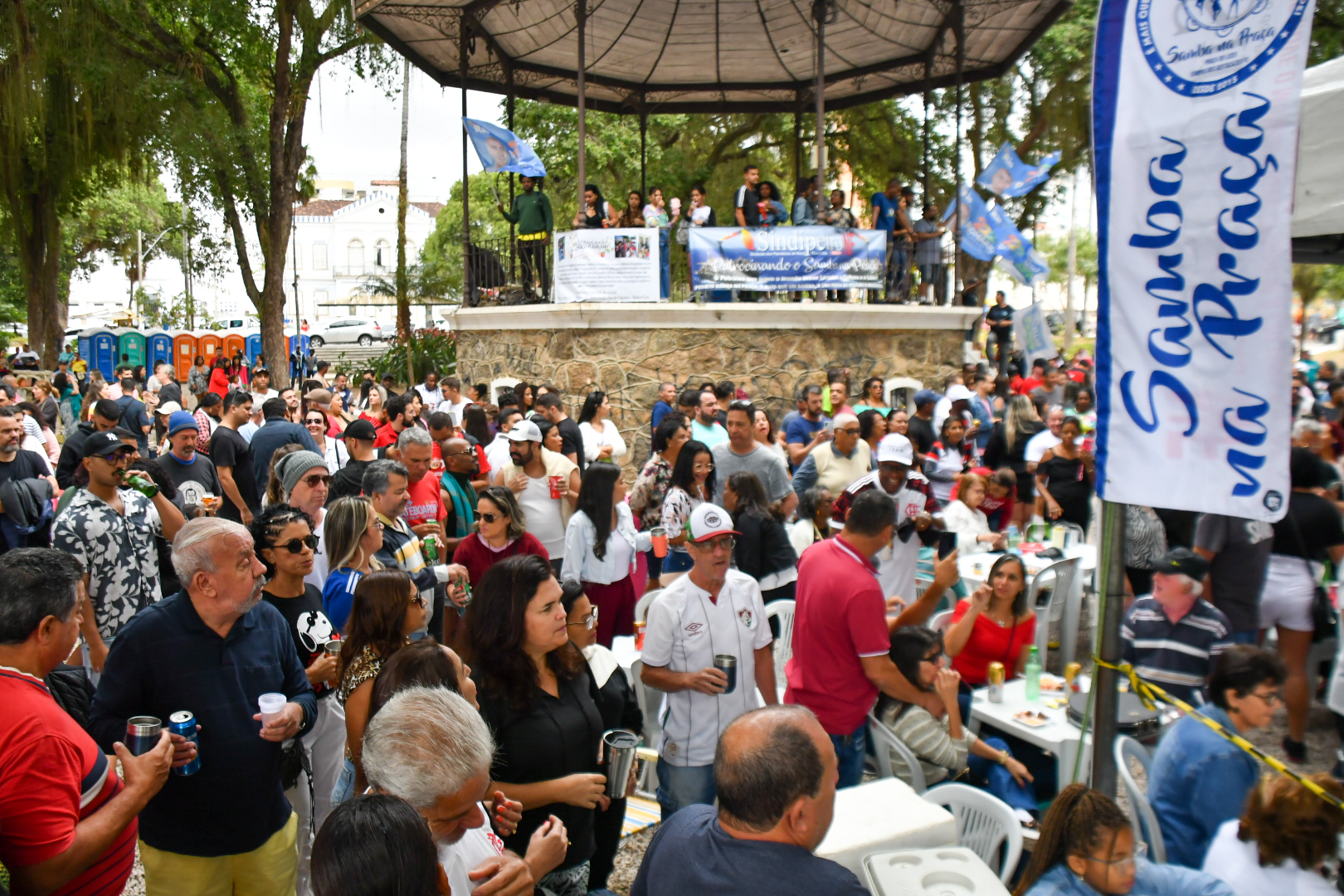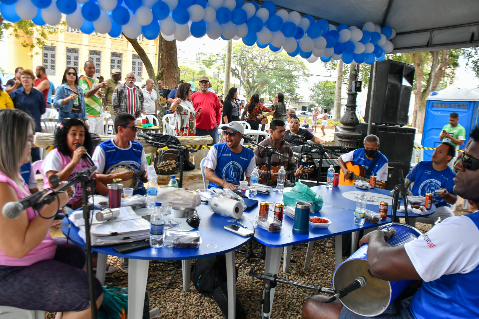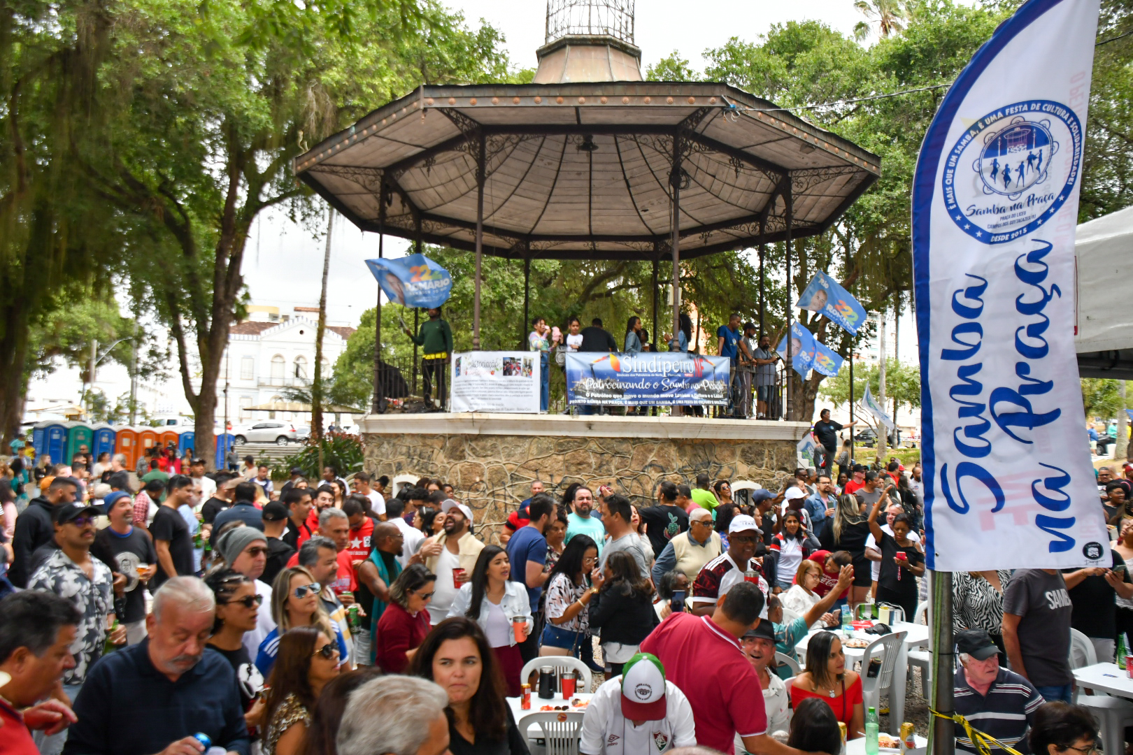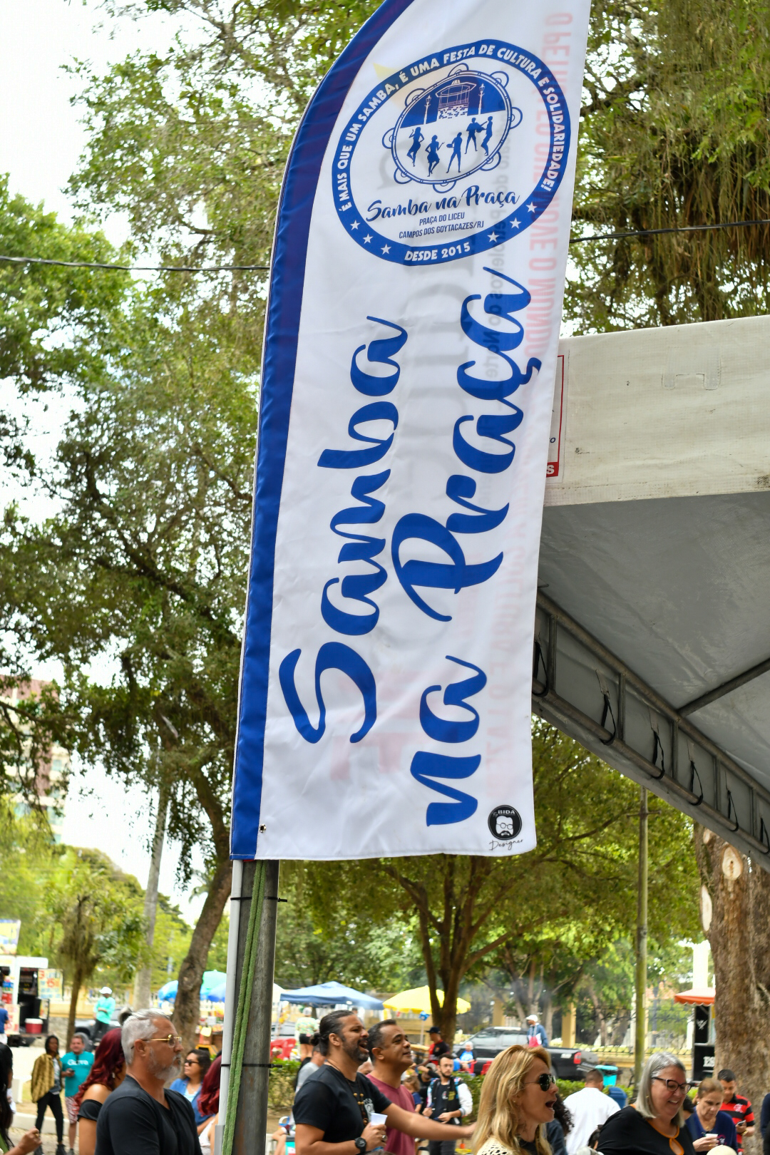 No último domingo, 21, não foi diferente. O Projeto Samba na Praça, que tem patrocínio do Sindipetro-NF (Sindicato dos Petroleiros do Norte Fluminense), completou 7 anos com uma edição que mereceu decoração especial marcada pelo azul e branco e roteiro solene de falas e agradecimentos em meio aos maiores clássicos do samba de raiz. Tudo sob uma luz nublada que driblava as copas das árvores e uma temperatura amena que dava tons ainda mais bucólicos ao jardim destinado a uma área de praça em 1860 (que ganhou a arquitetura que conserva até hoje após uma reforma em 1914).