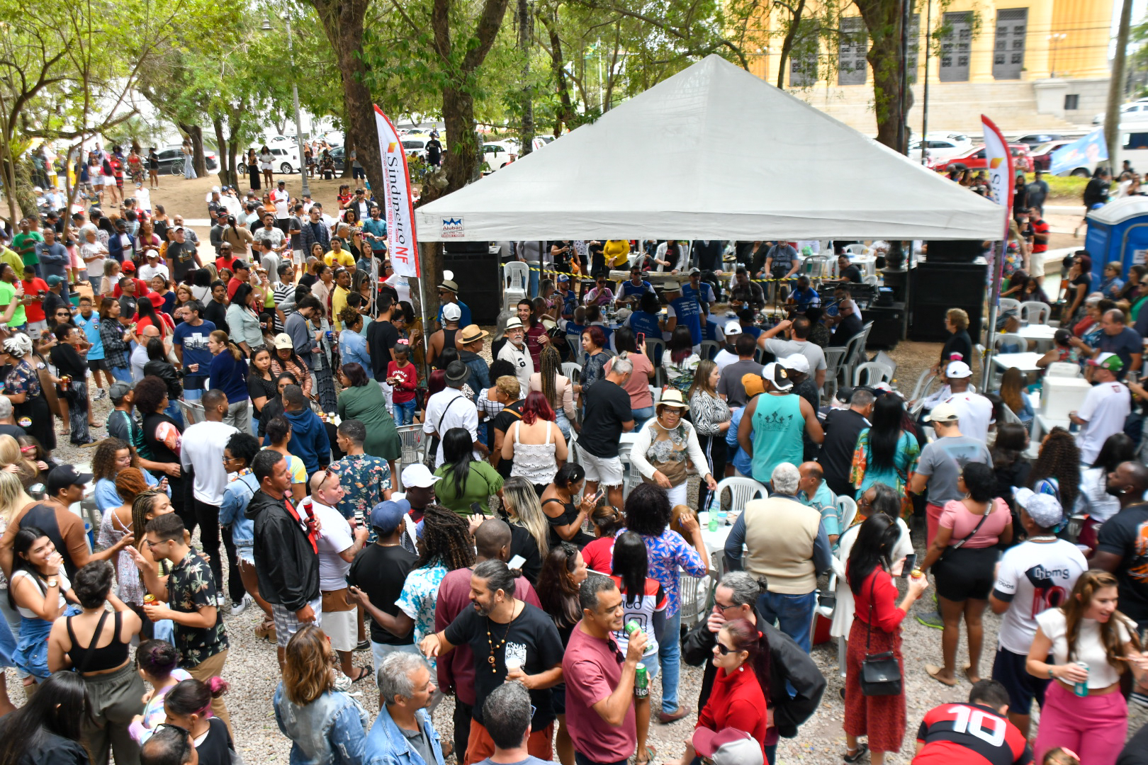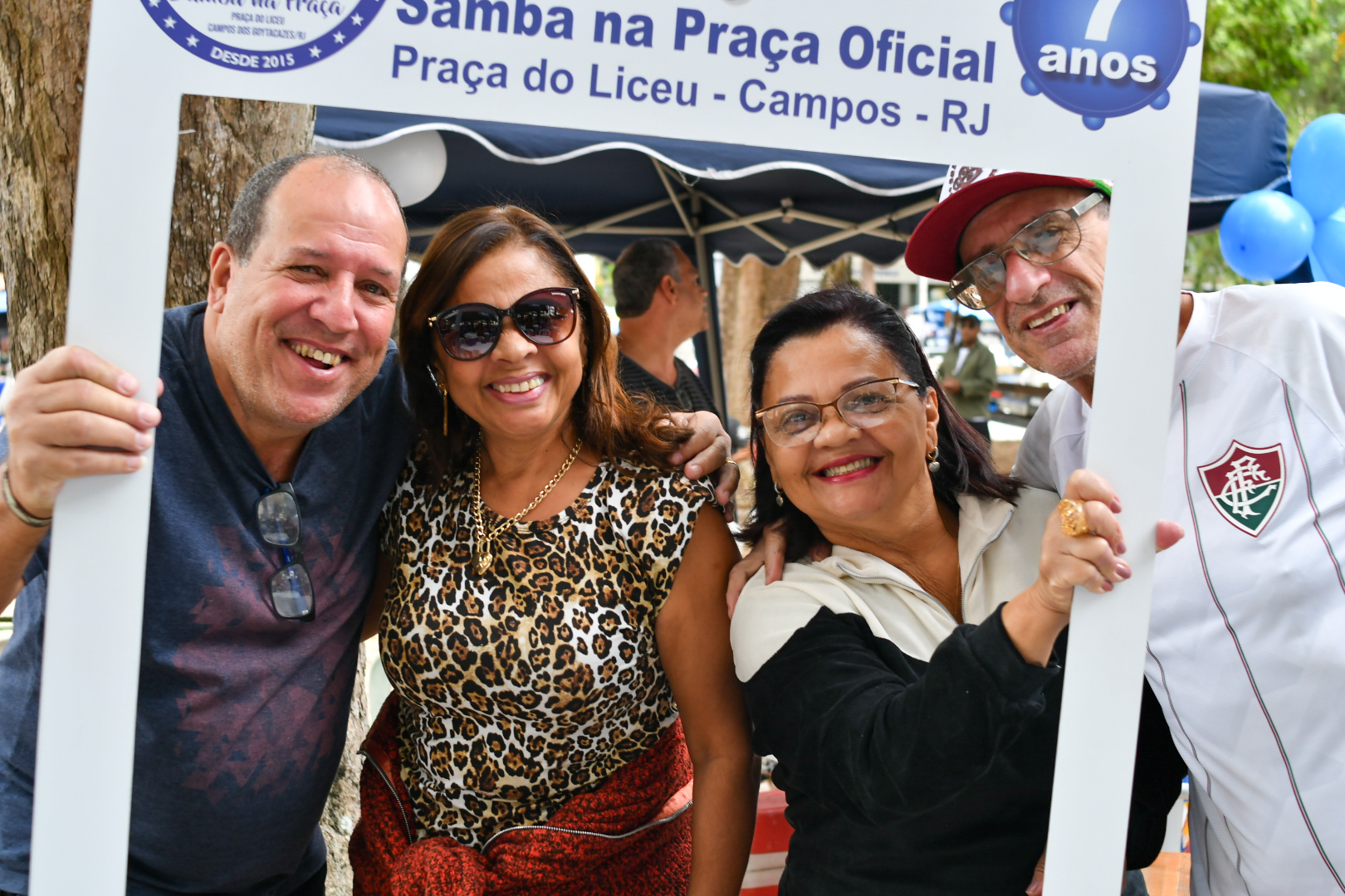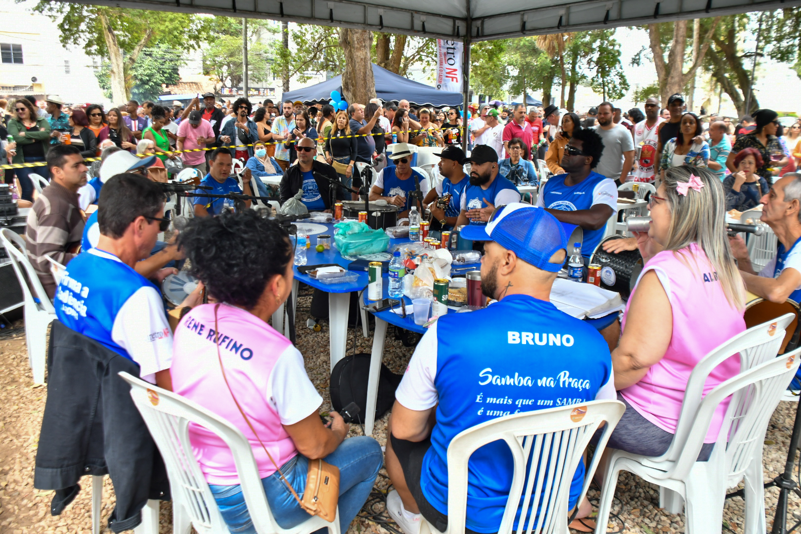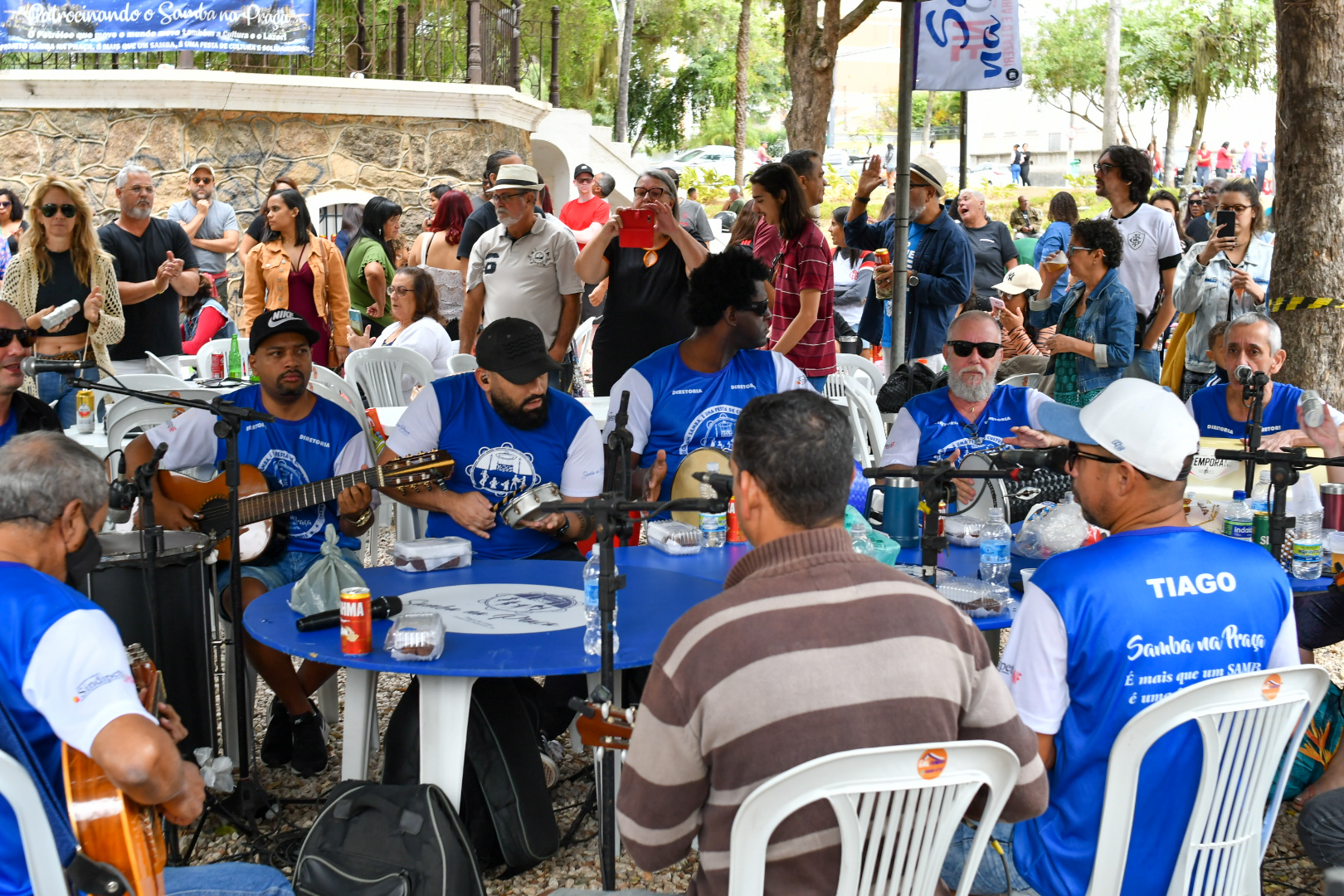 No último domingo, 21, não foi diferente. O Projeto Samba na Praça, que tem patrocínio do Sindipetro-NF (Sindicato dos Petroleiros do Norte Fluminense), completou 7 anos com uma edição que mereceu decoração especial marcada pelo azul e branco e roteiro solene de falas e agradecimentos em meio aos maiores clássicos do samba de raiz. Tudo sob uma luz nublada que driblava as copas das árvores e uma temperatura amena que dava tons ainda mais bucólicos ao jardim destinado a uma área de praça em 1860 (que ganhou a arquitetura que conserva até hoje após uma reforma em 1914).