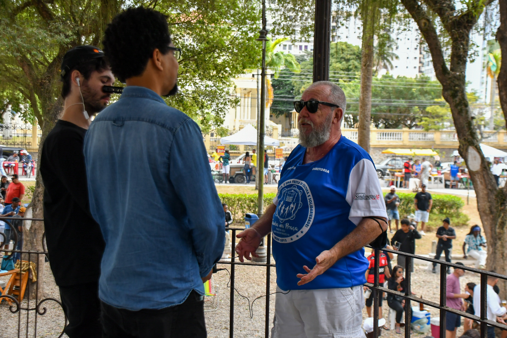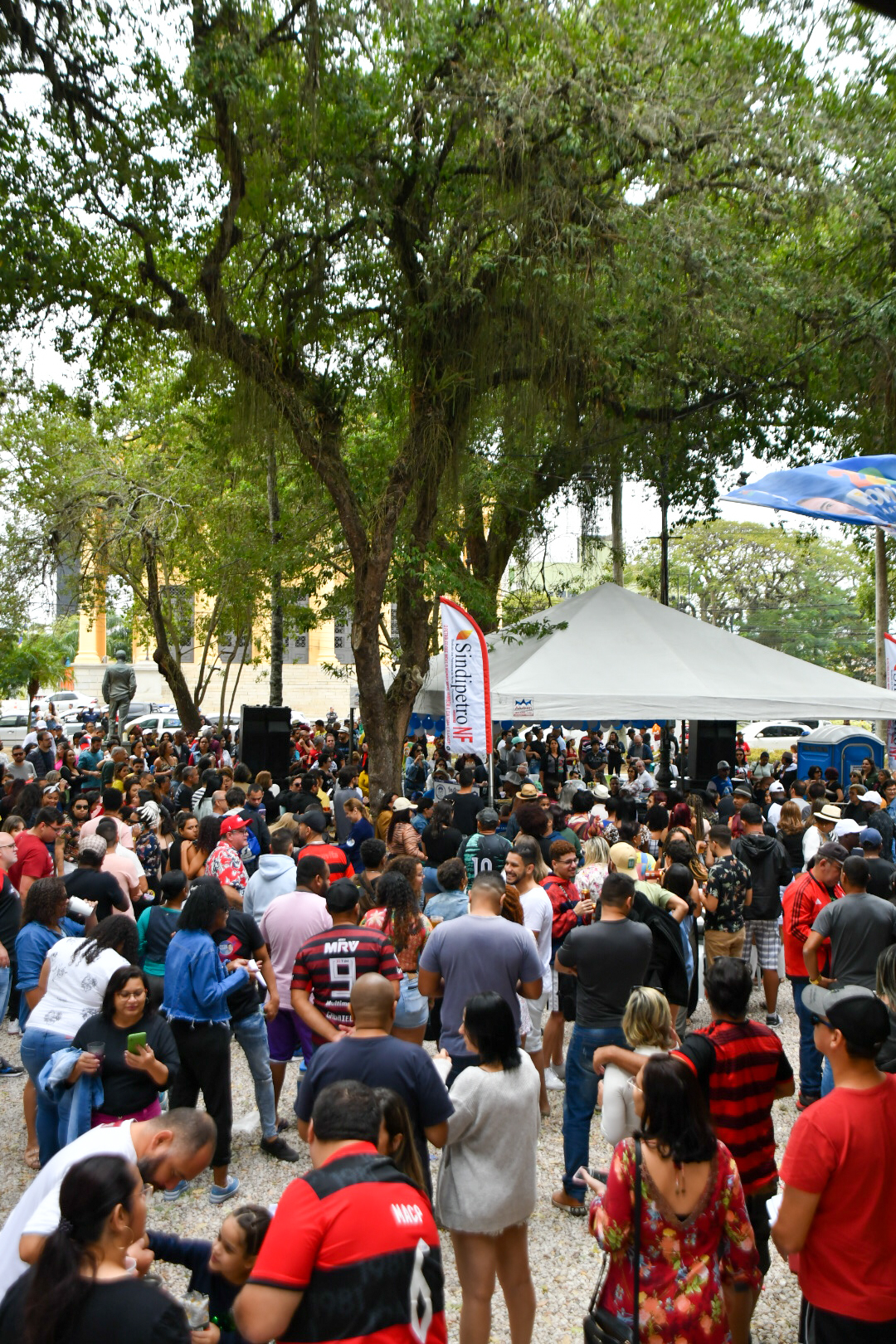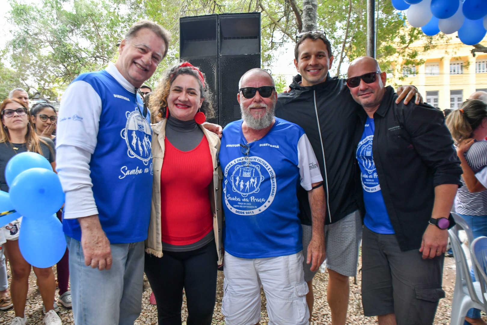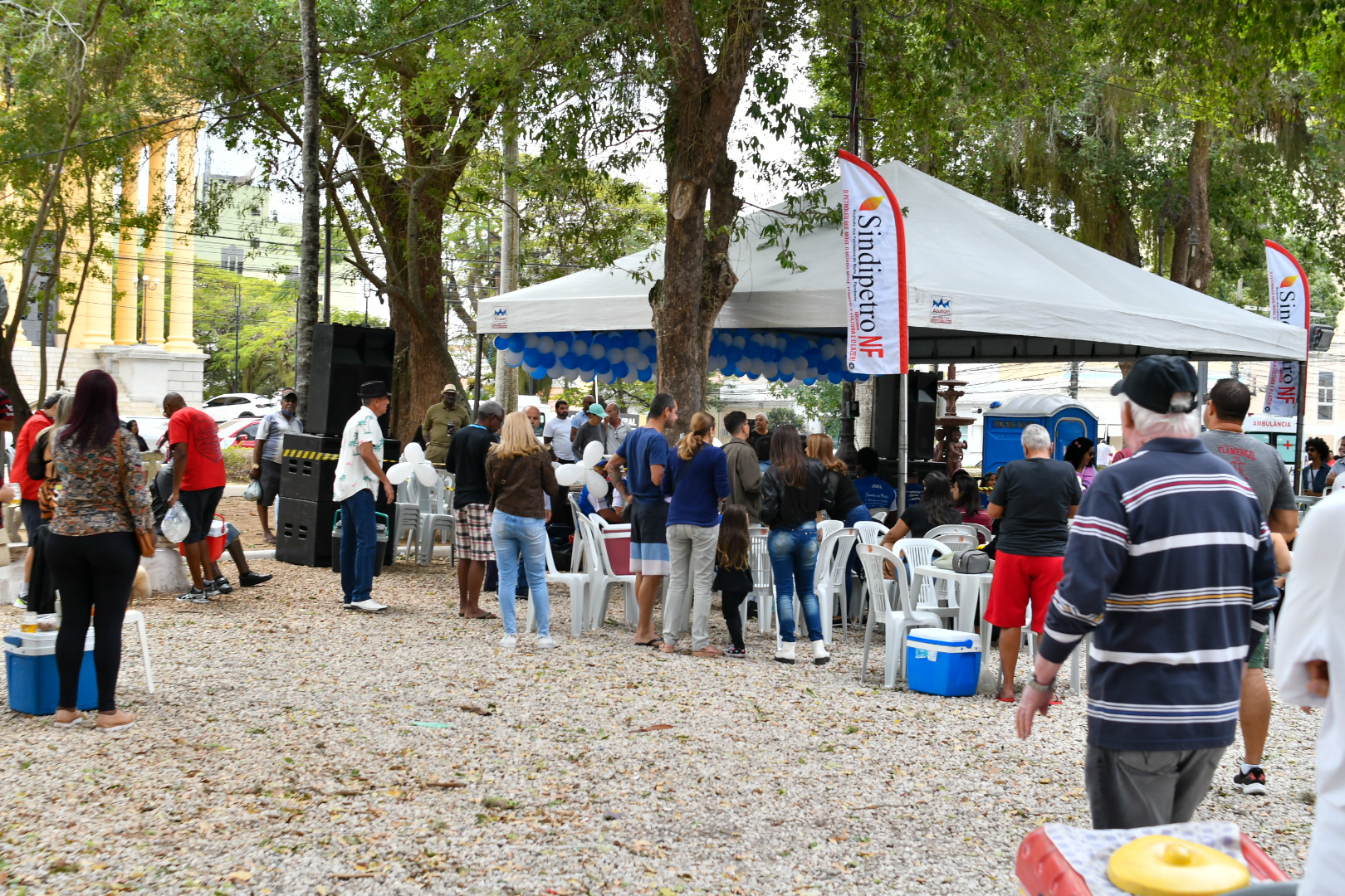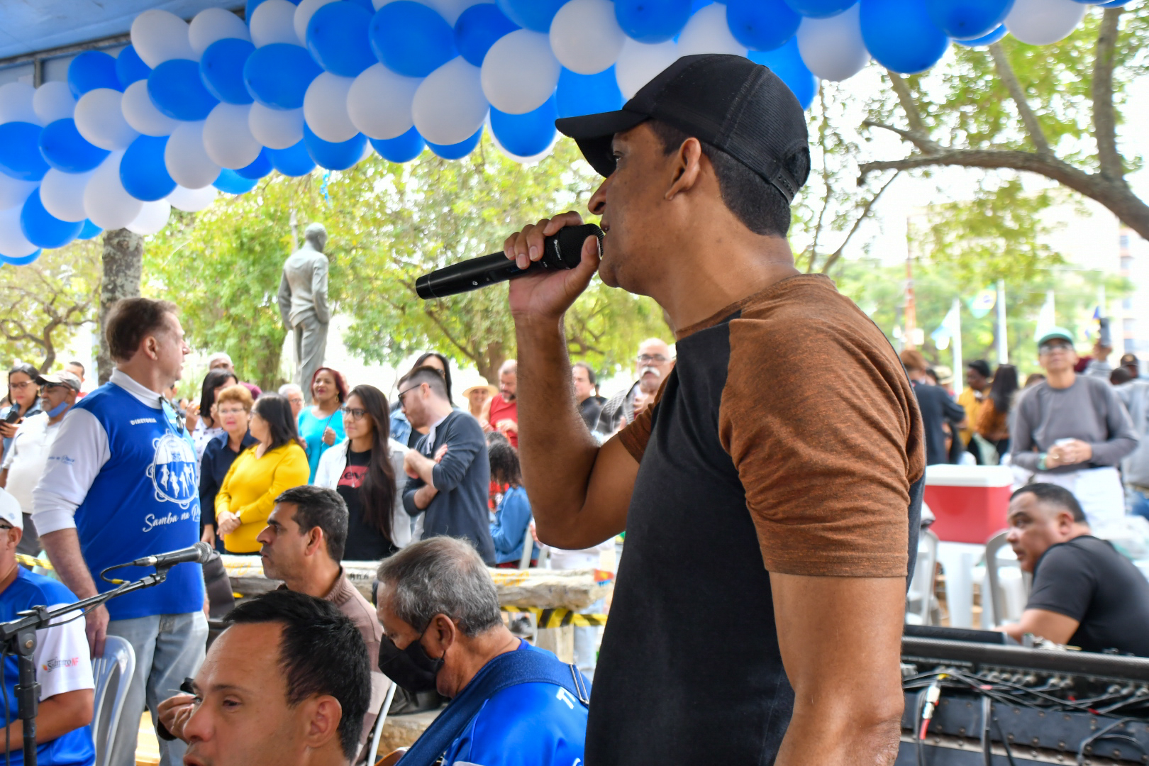 No último domingo, 21, não foi diferente. O Projeto Samba na Praça, que tem patrocínio do Sindipetro-NF (Sindicato dos Petroleiros do Norte Fluminense), completou 7 anos com uma edição que mereceu decoração especial marcada pelo azul e branco e roteiro solene de falas e agradecimentos em meio aos maiores clássicos do samba de raiz. Tudo sob uma luz nublada que driblava as copas das árvores e uma temperatura amena que dava tons ainda mais bucólicos ao jardim destinado a uma área de praça em 1860 (que ganhou a arquitetura que conserva até hoje após uma reforma em 1914).