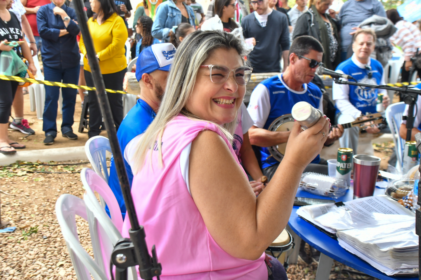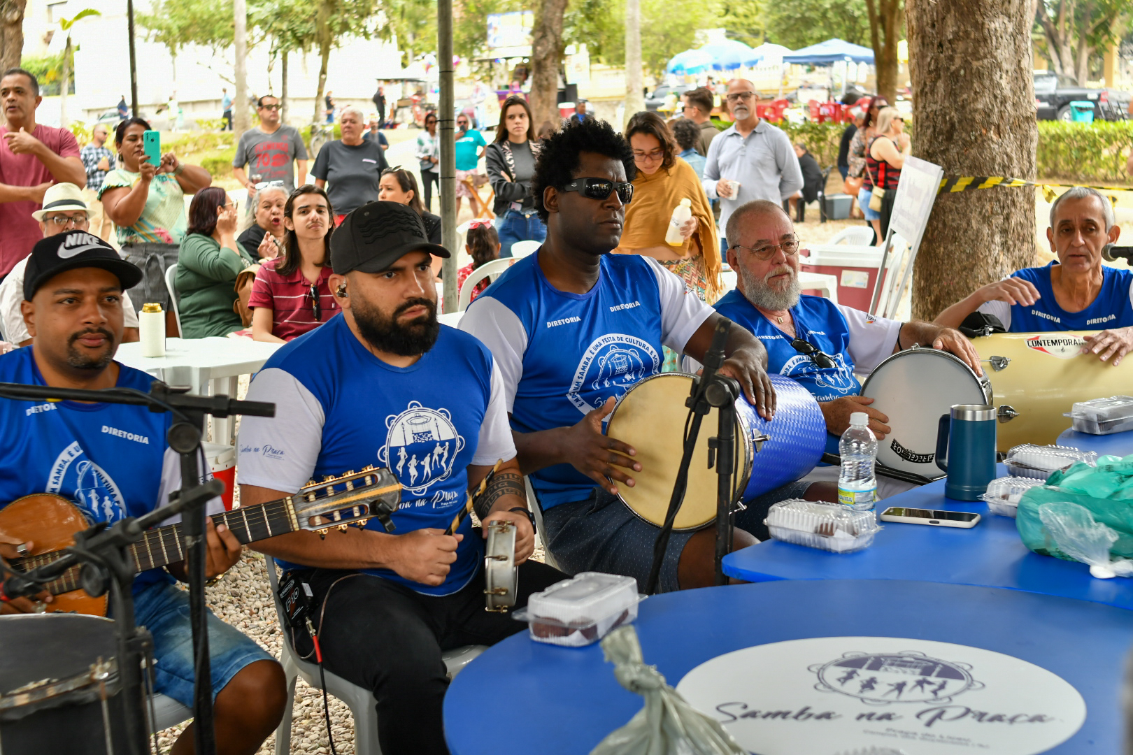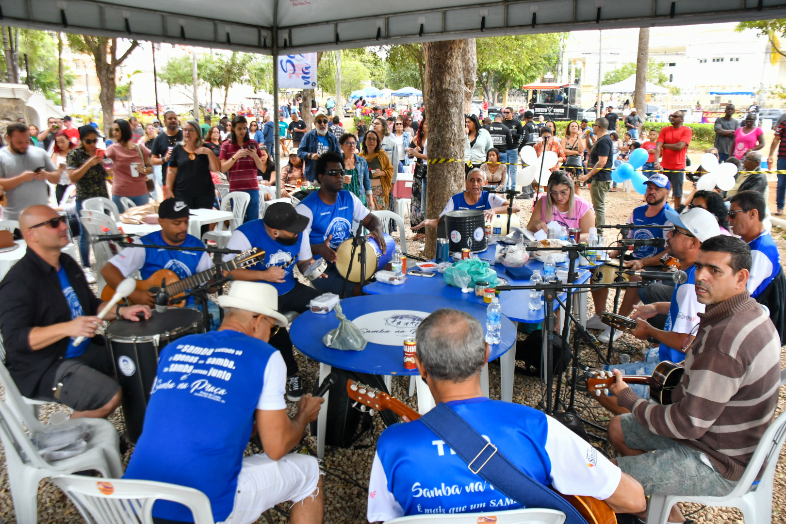 Os músicos que fazem o povo sambar cantam e tocam em uma mesa com 15 integrantes unidos pela paixão pelo ritmo. “Menos da metade são músicos profissionais, o restante tem suas profissões e com o passar dos anos foram se fixando na nossa roda e hoje fazem parte da família Samba na Praça. Tínhamos uma base no Grupo Cadência do Samba e os demais foram chegando e ficando, o principal requisito é ter paixão pelo samba e compromisso com o projeto”, explica o produtor.