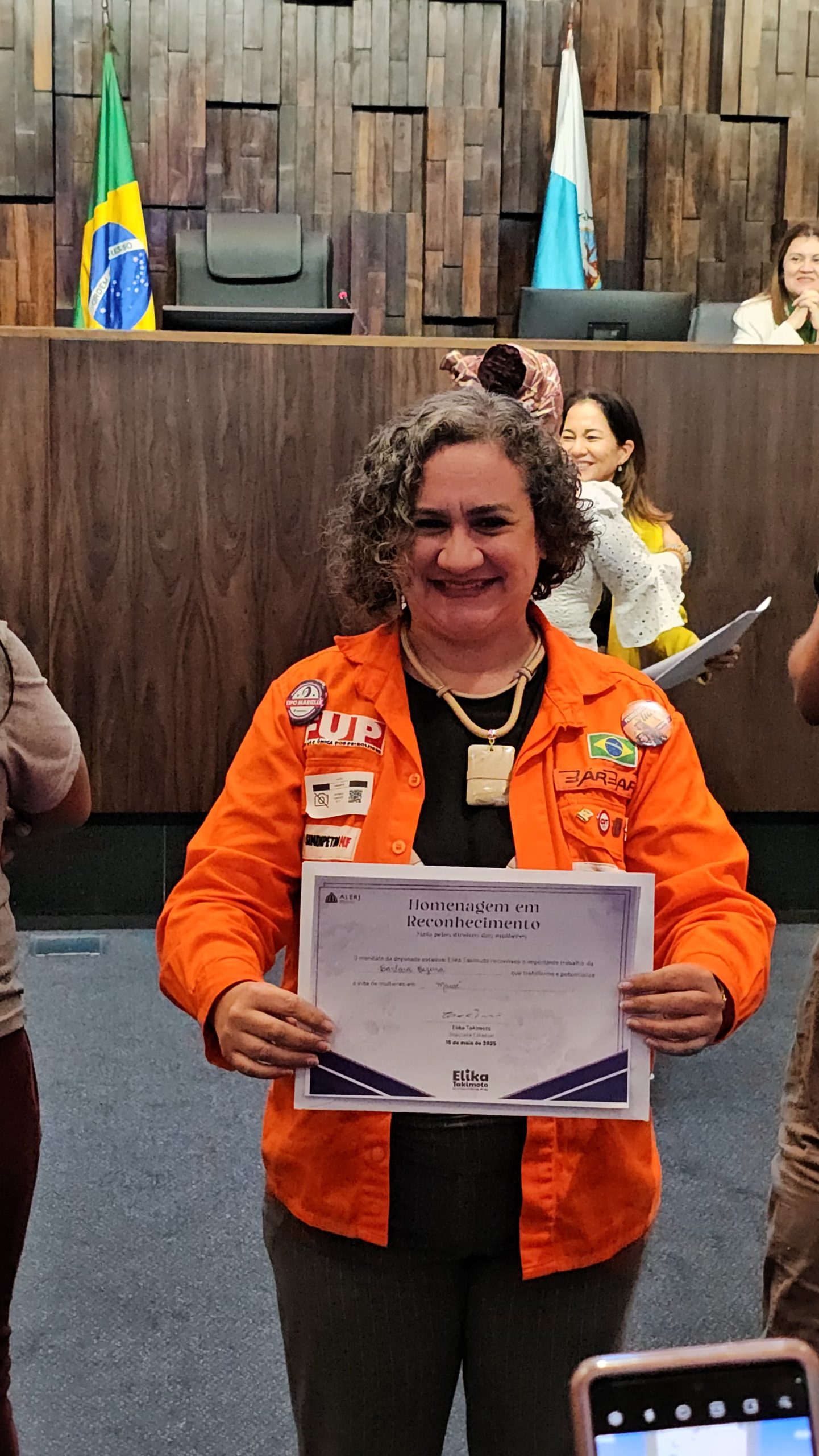 A diretora do Sindipetro-NF e da FUP, Bárbara Bezerra, foi uma das mulheres homenageadas, ontem, em atividade promovida pelo mandato da deputada Elika Takimoto (PT) para marcar o “Maio pelos Direitos das Mulheres”, na Alerj (Assembleia Legislativa do Rio de Janeiro).