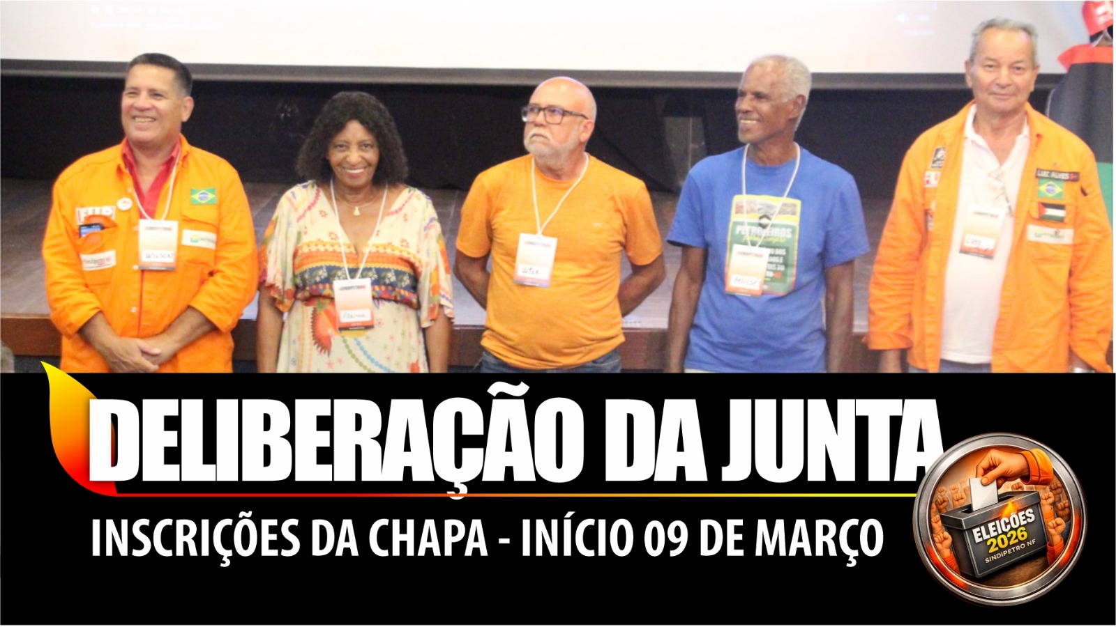 A Junta Eleitoral do Sindipetro-NF publica abaixo edital sobre a abertura do prazo para inscrição de chapas que irão concorrer às eleições da diretoria colegiada e do Conselho Fiscal do sindicato para o mandato 2026/2029.