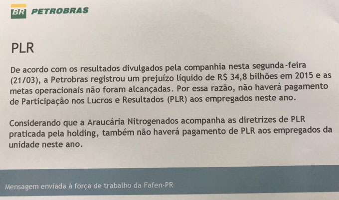Março de 2016 – Araucária Nitrogenados envia e-mail aos trabalhadores em 22/03, informando que não quitaria a PLR, apesar do lucro registrado em 2015, alegando que acompanha as diretrizes praticadas pela holding. Como o Sistema Petrobrás não auferiu lucro, nem atingiu as metas, os gestores da Fafen-PR informaram que seguiriam a holding e não pagaram a PLR.