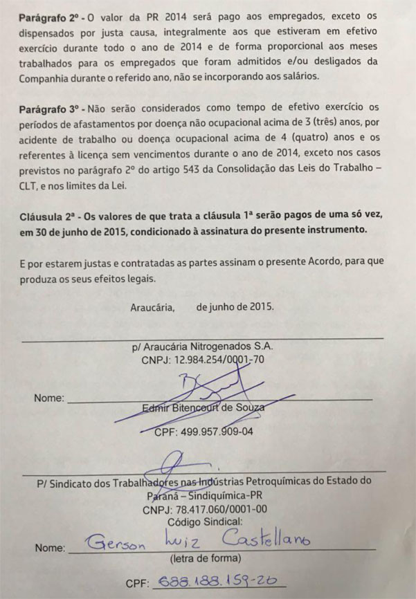 Junho de 2015 – Em junho, a Araucária Nitrogenados e o Sindiquimica-PR assinam termo de quitação da Participação nos Resultados (PR) de 2014, conforme pactuado no Acordo de Metodologia para Pagamento da PLR, após negociação com a FUP e seus sindicatos.