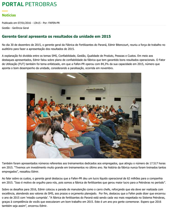 Dezembro de 2015 – No final de dezembro, a diretoria da Araucária Nitrogenados reúne todos trabalhadores em auditório para informar o excelente lucro e resultado da empresa.