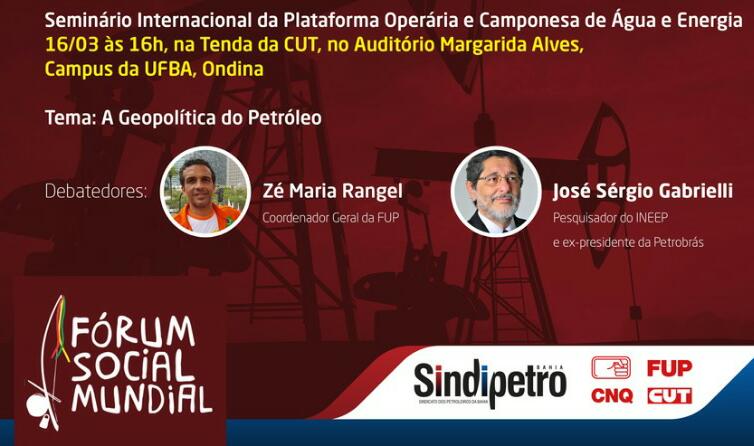 FUP – Junto com pesquisadores e dirigentes do Instituto de Estudos Estratégicos de Petróleo, Gás Natural e Biocombustíveis Zé Eduardo Dutra (INEEP), a FUP segue em Salvador, no Fórum Social Mundial, discutindo a importância da Petrobrás e do setor petróleo para o desenvolvimento do país e a soberania nacional. Nesta sexta-feira,16, os petroleiros participam do Seminário Internacional da Plataforma Operária e Camponesa de Água e Energia. O evento terá início as 15h30 na Tenda da CUT, no campus de Ondina da Universidade Federal da Bahia.