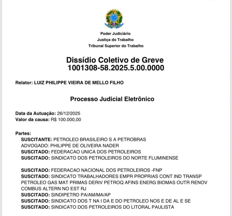 O ministro também agendou audiência de conciliação entre os sindicatos em greve e a Petrobrás para o próximo dia 2 de janeiro, às 14h, na sede do TST. Além disso, a decisão prevê a realização de sessão extraordinária da Seção Especializada em Dissídios Coletivos (SDC) para 6 de janeiro, às 13h30, para o julgamento do dissídio coletivo.