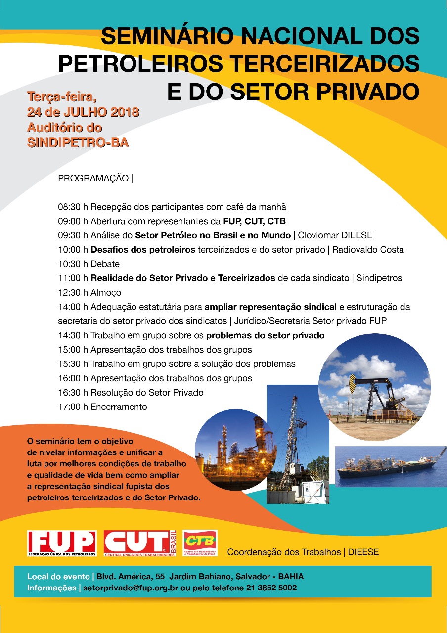 Imprensa da FUP – No dia 24 de julho, a FUP e seus sindicatos realizam na Bahia o Seminário Nacional dos Petroleiros Terceirizados e do Setor Privado, para discutir ações políticas e sindicais voltadas para esse importante segmento da categoria. O objetivo central do encontro é unificar a luta por melhores condições de trabalho e qualidade de vida dos trabalhadores terceirizados que atuam na indústria de petróleo e os empregados das operadoras privadas. Outro ponto fundamental do seminário é traçar uma política nacional para ampliar a representação destes petroleiros pela FUP e seus sindicatos filiados.