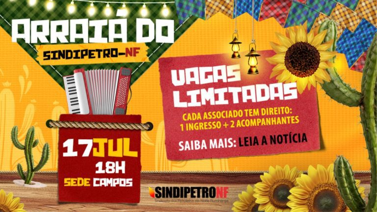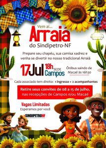 O Sindipetro-NF realiza, no próximo dia 17, o seu tradicional arraiá, às 18h, na sede de Campos dos Goytacazes. O ingresso, que precisa ser retirado entre os dias 8 e 15 de julho (vagas limitadas), presencialmente nas recepções de qualquer uma das duas sedes da entidade, dá direito à entrada do associado ou associada e de mais dois acompanhantes.
