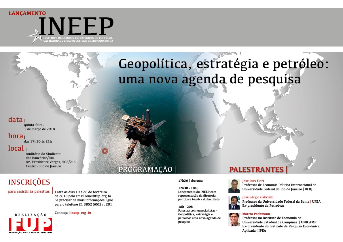 Estão abertas as inscrições para a palestra de lançamento do Instituto de Estudos Estratégicos de Petróleo, Gás Natural e Biocombustíveis Zé Eduardo Dutra (INEEP), que acontecerá na noite de primeiro de março, no Rio de Janeiro. “Geopolítica, estratégia e petróleo: uma nova agenda de pesquisa”, o tema da palestra, sintetiza a proposta central do Instituto, uma iniciativa da FUP, que tem por objetivo fomentar debates e propostas para o setor de óleo e gás.