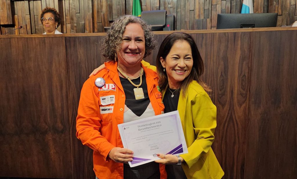 HOMENAGEM A diretora do Sindipetro-NF e da FUP, Bárbara Bezerra, foi uma das mulheres homenageadas, no último dia 15, em atividade promovida pelo mandato da deputada estadual Elika Takimoto (PT) para marcar o “Maio pelos Direitos das Mulheres”, na Alerj. Bárbara é graduada em Ciências Sociais pela UFRN e, na Petrobras, atua em outra área de formação, de técnica de segurança no trabalho. A sindicalista tem obtido grande destaque.