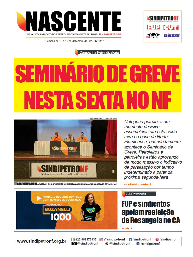 Os resultados parciais das assembleias no Norte Fluminense, até o fechamento desta edição do Nascente — às 12h desta terça-feira (09) — tem sido uma expressão eloquente dessa unidade, com mais de 99% de aprovação do indicativo de greve por tempo indeterminado a partir do próximo dia 15, no cenário em que a empresa prossiga com a sua contraproposta rebaixada e sem atender aos eixos centrais de reivindicações. Sigamos juntos, juntas e fortes, e que não ousem duvidar da capacidade de luta da classe trabalhadora.