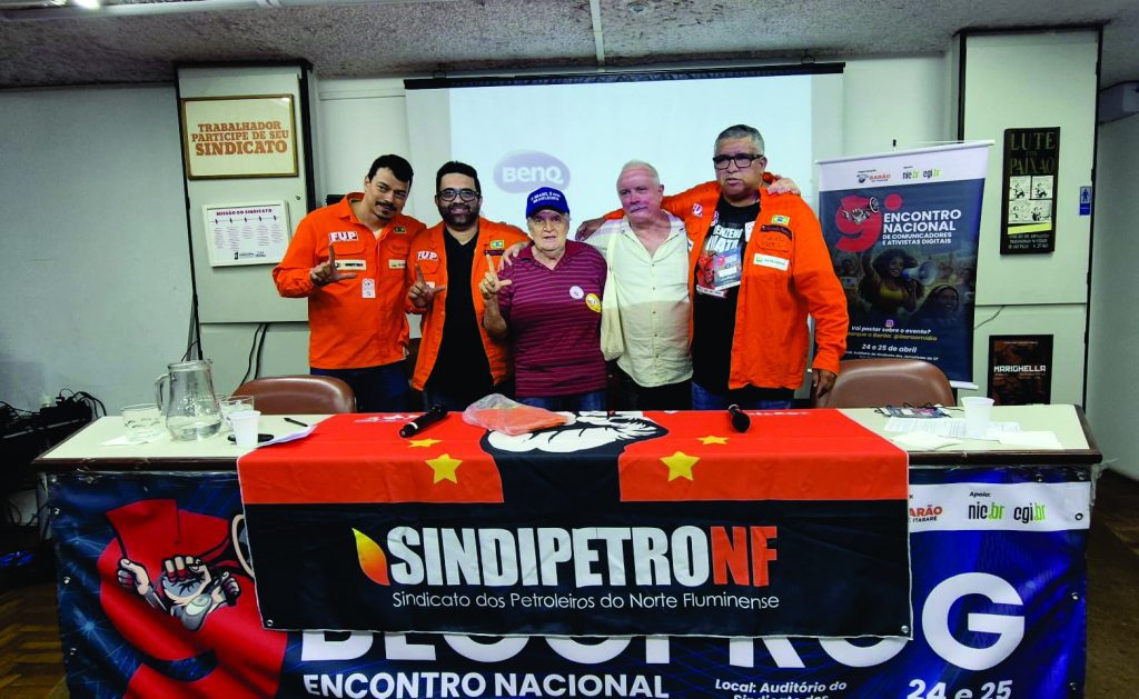 FORÇA DIGITAL O Sindipetro-NF participou, neste final de semana, do 9º Encontro Nacional de Comunicadores e Ativistas Digitais, o BlogProg, realizado nos dias 24 e 25 de abril, em São Paulo. O evento contou com apoio do sindicato e teve a participação de diretores da entidade. Na foto, com os jalecos laranja, Johnny Souza, Benes Junior e Marcelo Nunes, que ladeiam os blogueiros progressistas Aparecido Araujo Lima, mais conhecido como Cidoli, e Altamiro Borges.