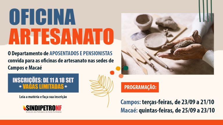 O Departamento de Aposentados e Pensionistas do Sindipetro-NF vai promover uma oficina de artesanato nas sedes de Campos dos Goytacazes e de Macaé. As inscrições estarão abertas no período de 11 a 18 de setembro, com vagas limitadas.