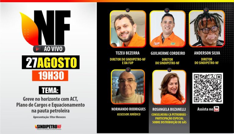 O programa NF ao vivo deste mês de agosto, que será veiculado hoje, às 19h30, tem como tema “Greve no horizonte com ACT, Plano de Cargos e Equacionamento na pauta petroleira”, na véspera do início das negociações com a Petrobrás — que tem reunião marcada com a FUP para esta quinta-feira (28).