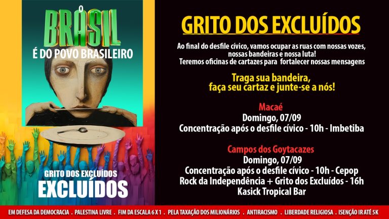 O Sindipetro-NF está chamando a sua base petroleira e toda a comunidade da região à participação intensa no tradicional Grito dos Excluídos, um protesto realizado há três décadas por sindicatos e movimentos sociais que costuma acontecer após os desfiles cívicos do Sete de Setembro. A edição deste ano tem como tema “Cuidar da Casa Comum e da Democracia é luta de todo dia”.
