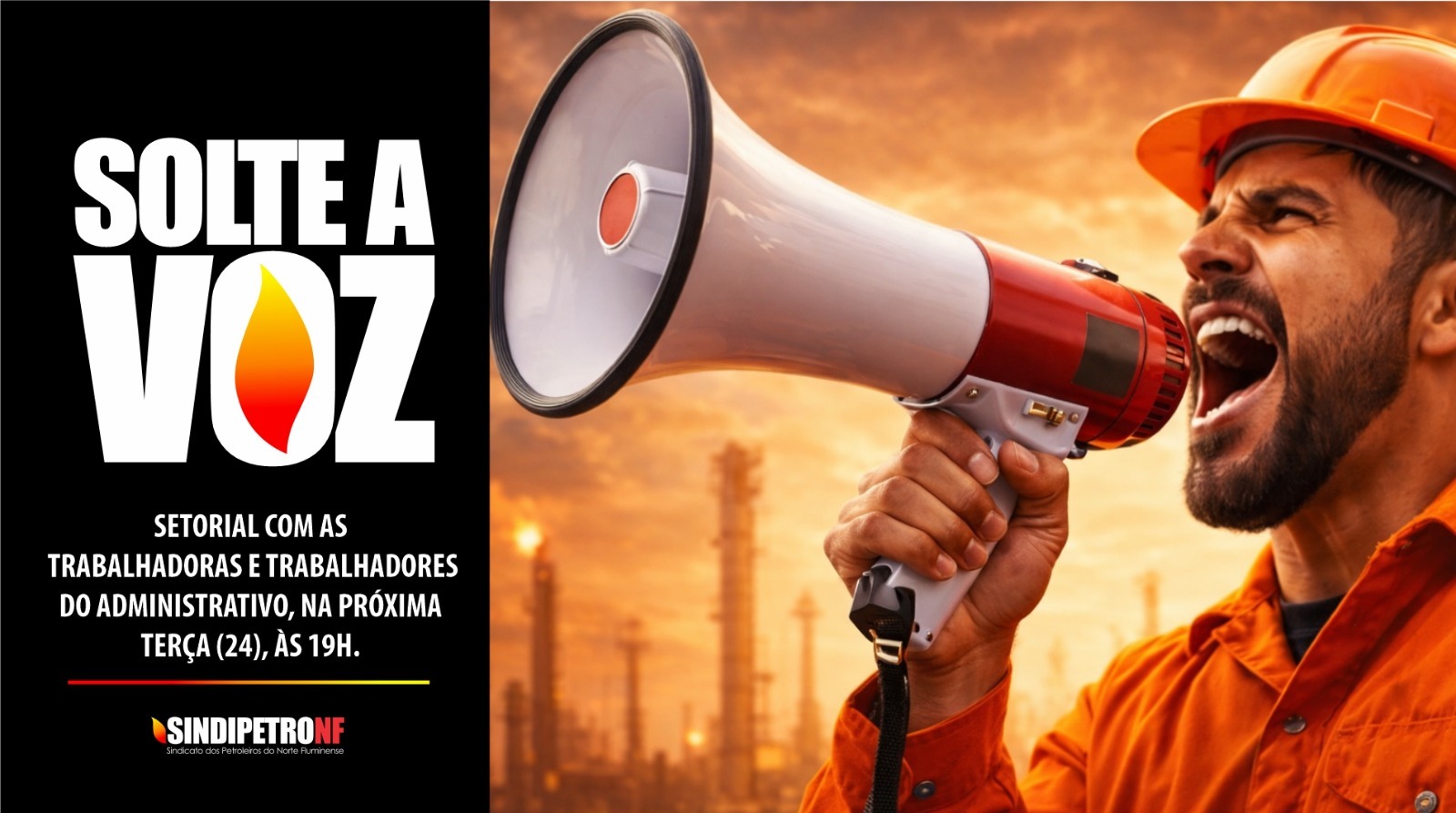O Sindipetro-NF realiza, na próxima terça-feira (24), às 19h, uma reunião setorial online voltada aos trabalhadores e trabalhadoras do setor Administrativo da base. A atividade, intitulada “Solta a Voz”, será um espaço exclusivo de diálogo entre a direção sindical e a categoria.