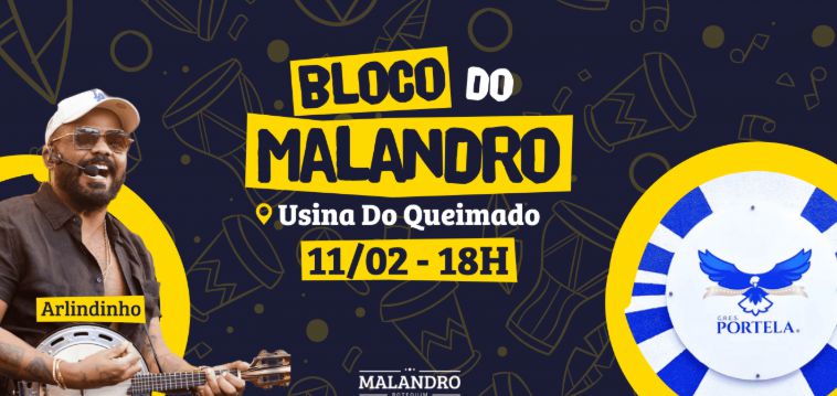 O Bloco do Malandro vai contar com apresentação da Bateria da Portela e de Arlindinho, além de DJ e roda de samba.