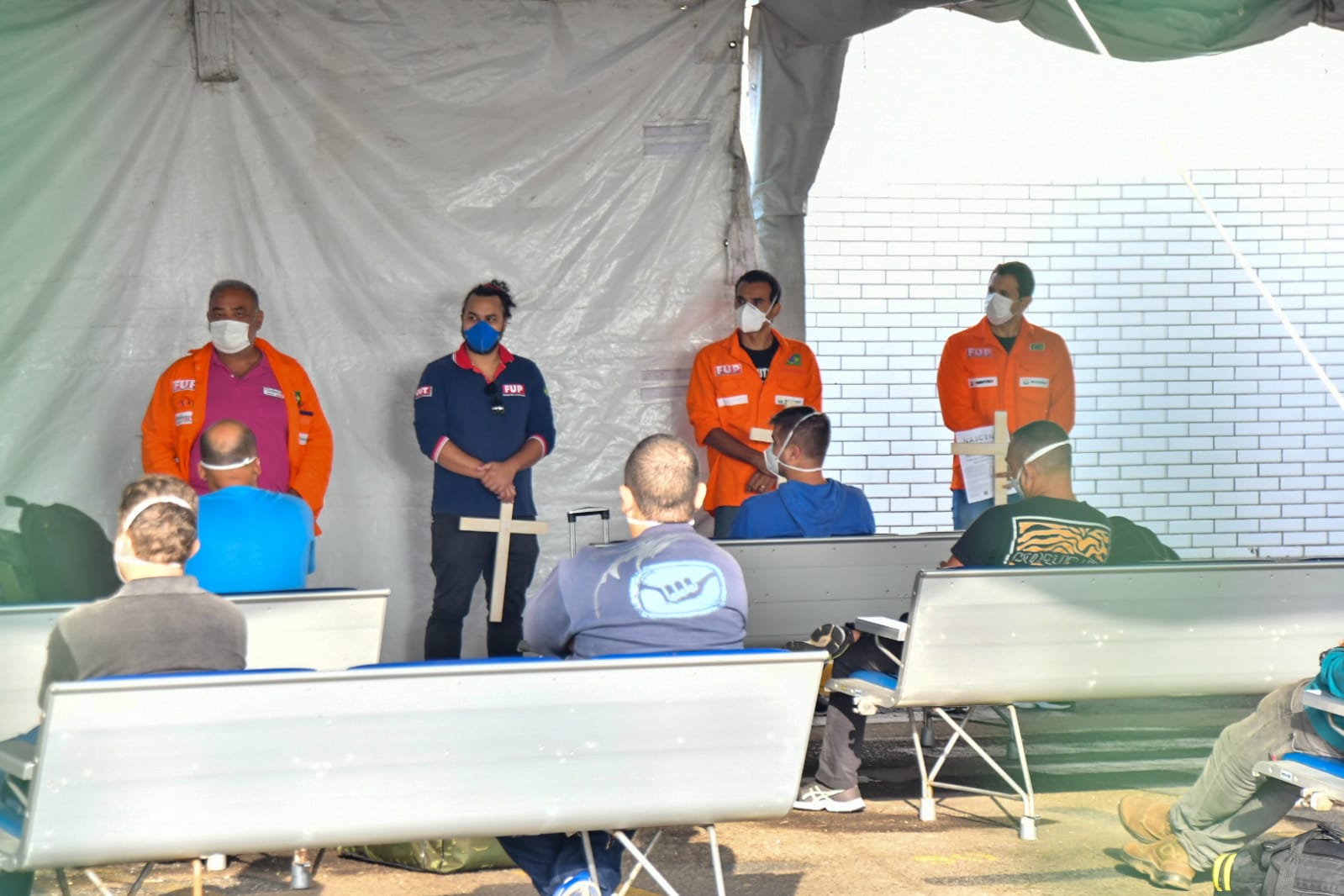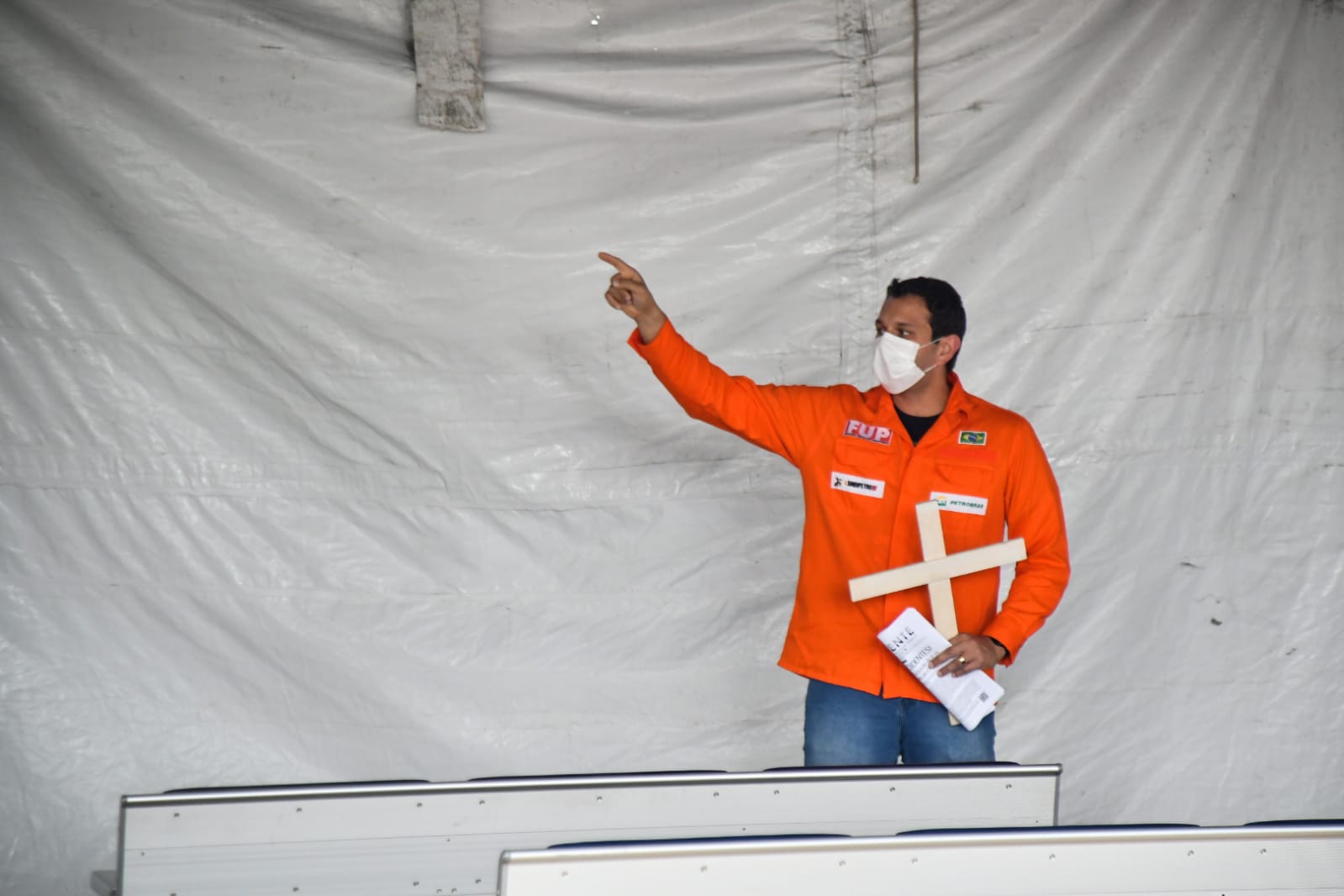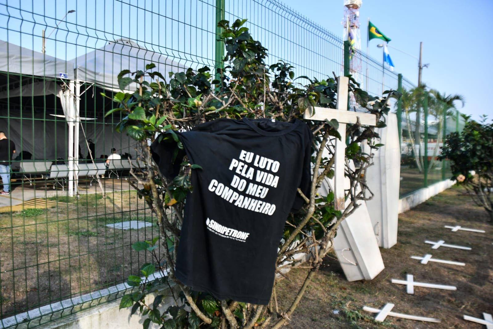 O ato no Farol começou nas primeiras horas da manhã de hoje. Sindicalistas fincaram cruzes nos canteiros próximos à entrada do heliporto e estenderam faixas. Uma delas alerta o trabalhador que “poderia ser você”, conscientizando sobre a necessidade de todos priorizarem a luta pela segurança no trabalho.