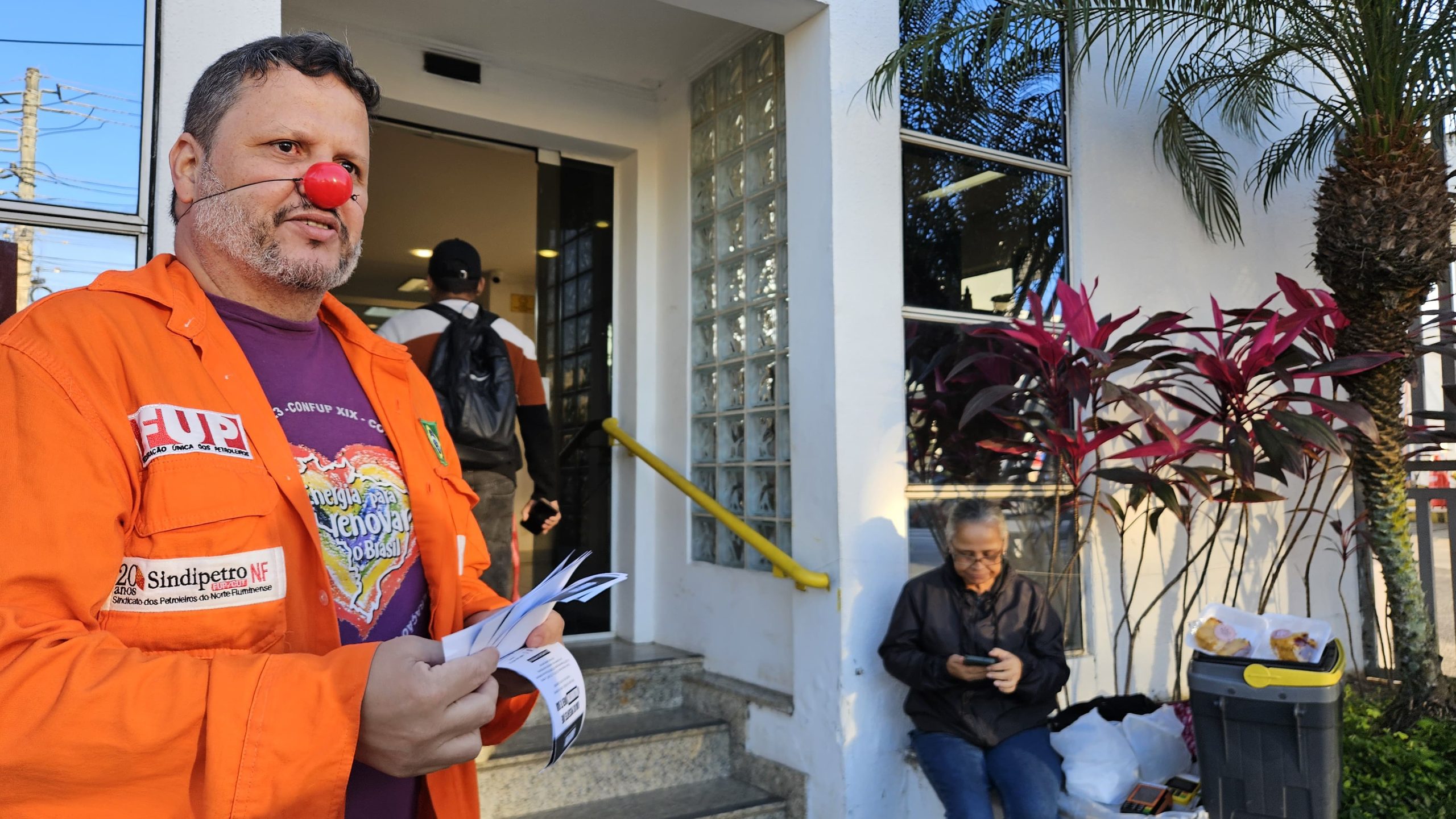 Utilizando narizes de palhaço, a diretora Jancileide Morgado e o diretor Eider Siqueira falaram sobre a indignação da categoria com a proposta rebaixada da empresa para o Acordo Coletivo de Trabalho, que sequer cobre a inflação do último período.