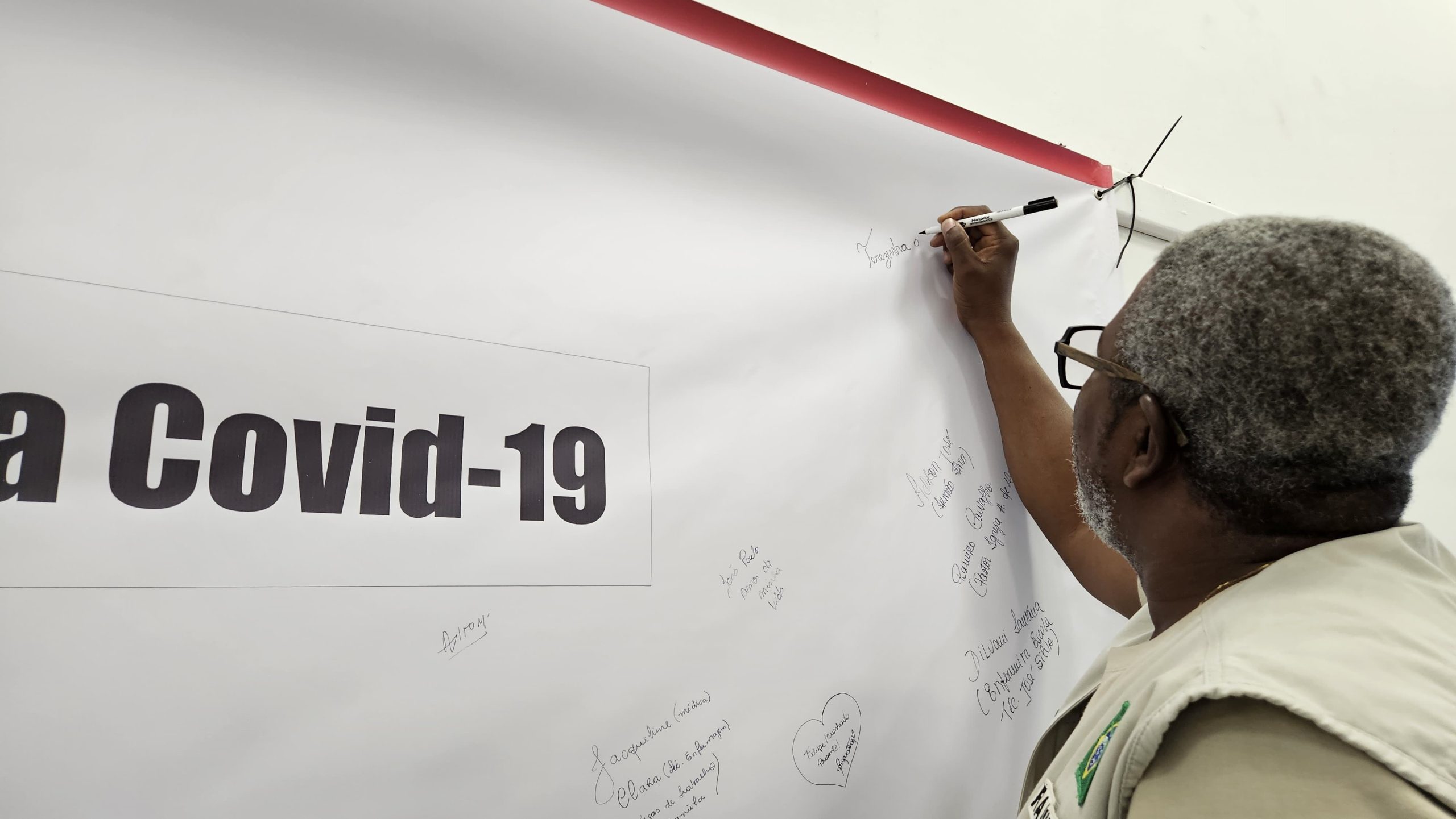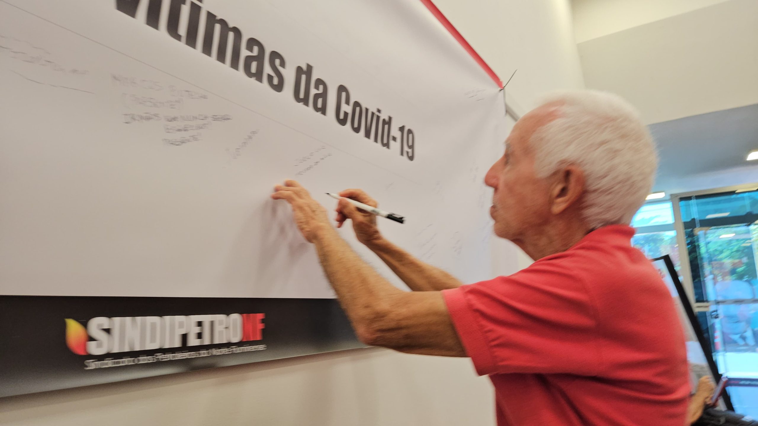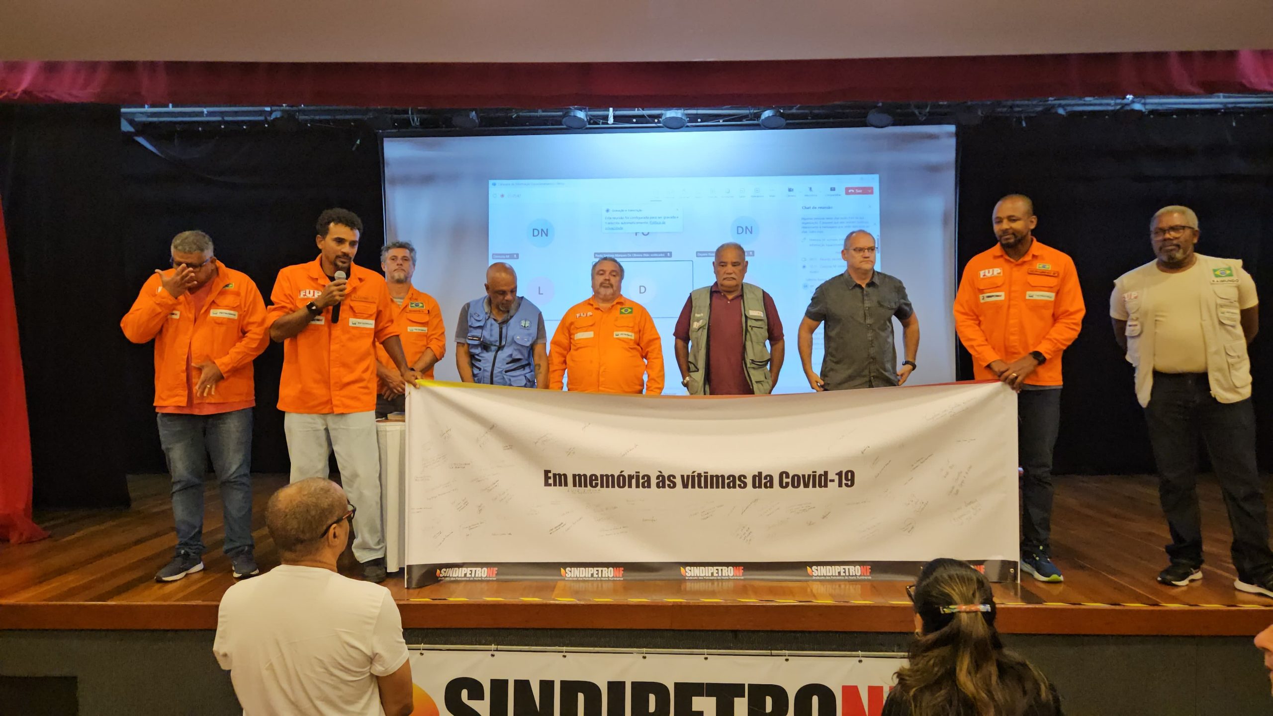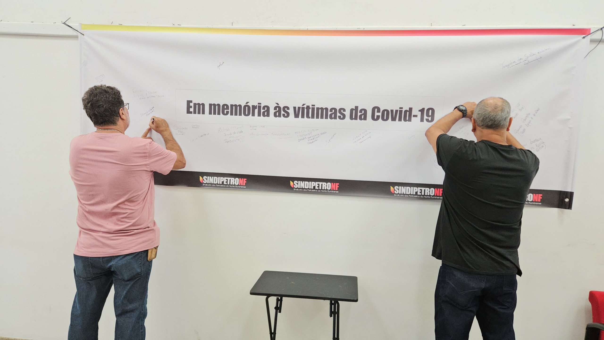 O Sindipetro-NF produziu uma faixa com a frase “Em memória às vítimas da Covid-19”, cercada por grande espaço em branco, para que todos e todas pudessem registrar nomes e mensagens sobre as vítimas do seu convívio familiar, de trabalho ou amizade.