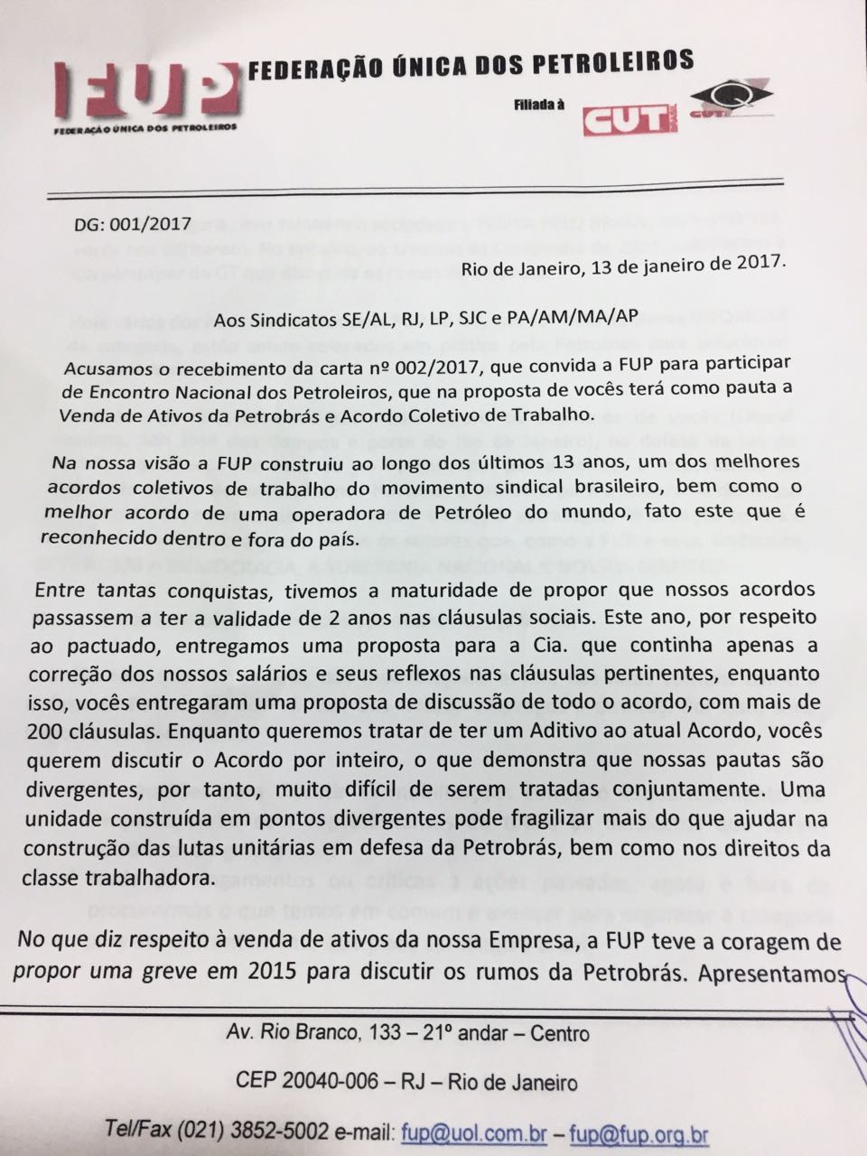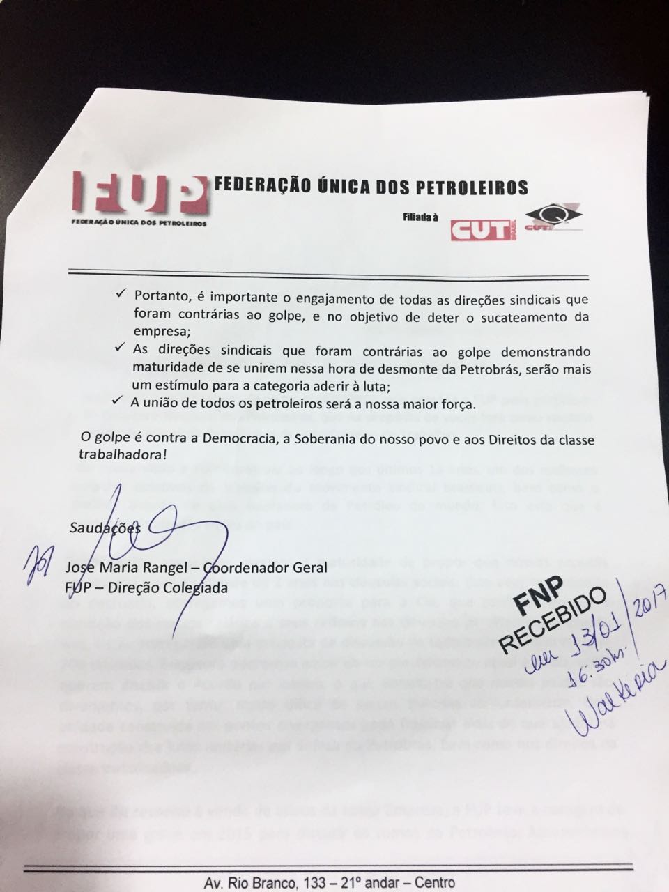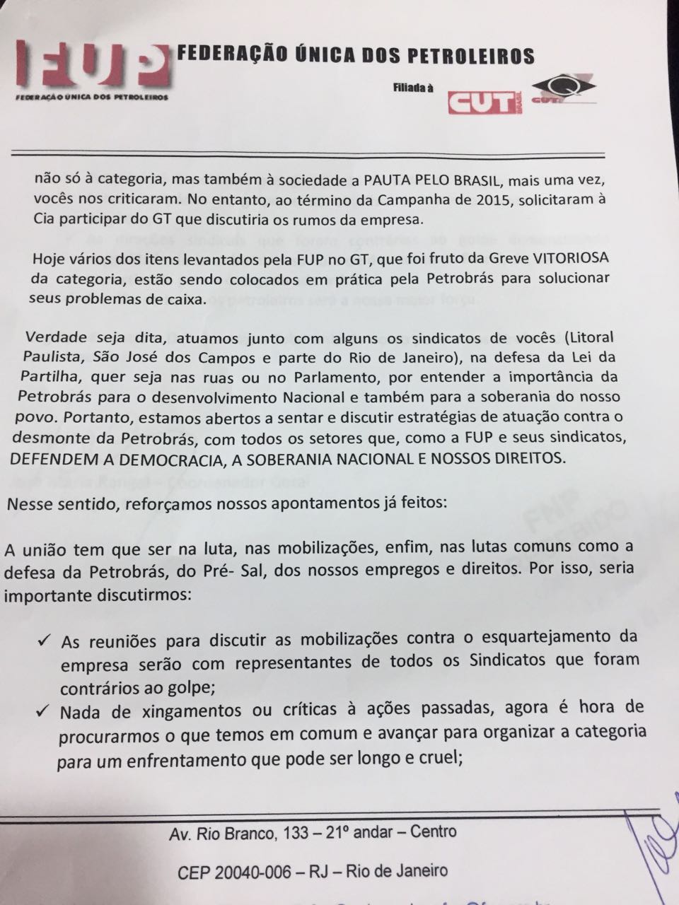“As direções sindicais que foram contrárias ao golpe demonstrando maturidade de se unirem nessa hora de desmonte da Petrobrás serão mais um estímulo para a categoria aderir à luta”, reitera a FUP no documento.