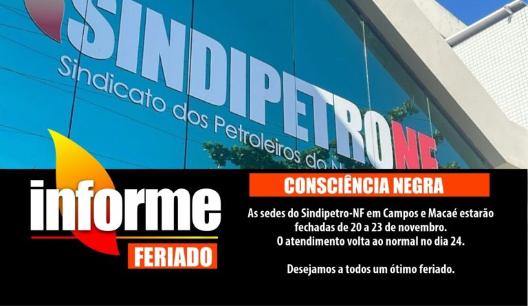 Em razão do feriado de 20 de novembro, Dia da Consciência Negra, e de recesso pactuado com os funcionários da entidade no dia 21 de novembro, as sedes do Sindipetro-NF não abrirão nesta quinta-feira e sexta-feira, assim como no final de semana. As atividades normais retornam na segunda-feira (24).