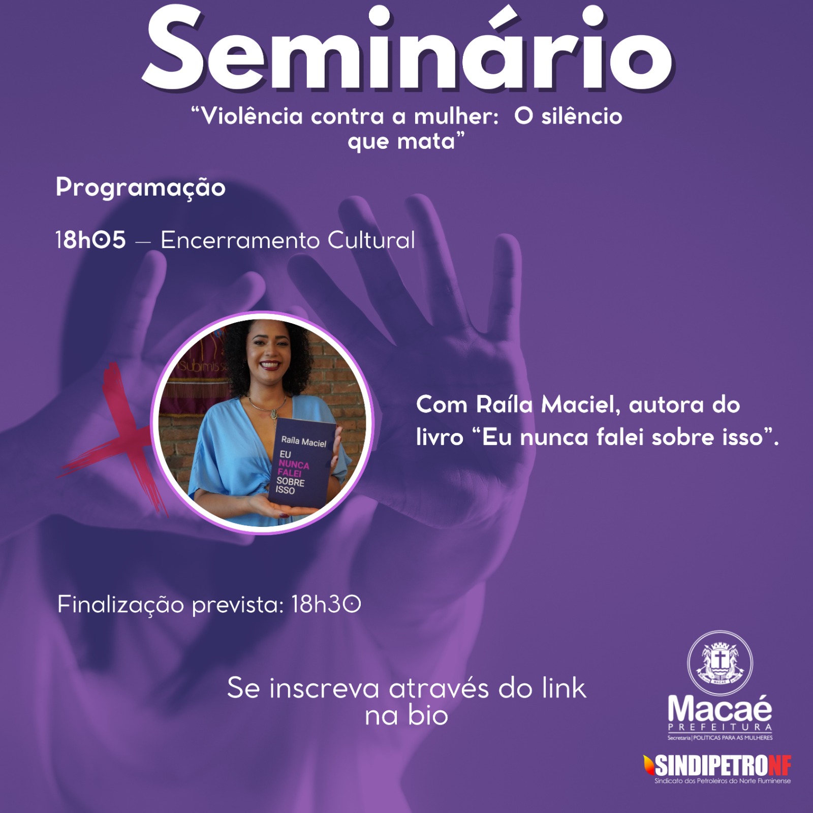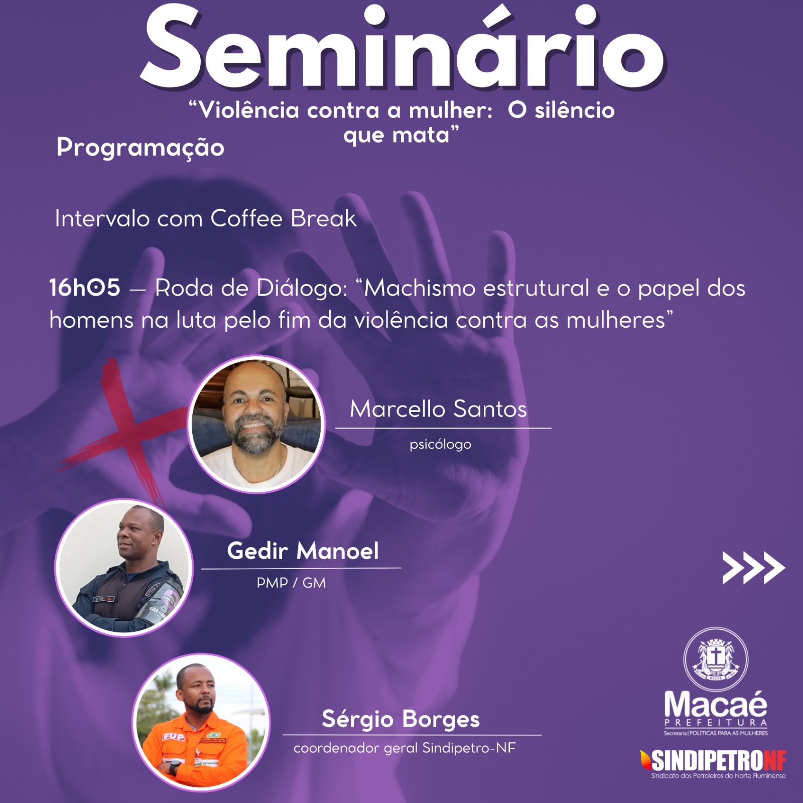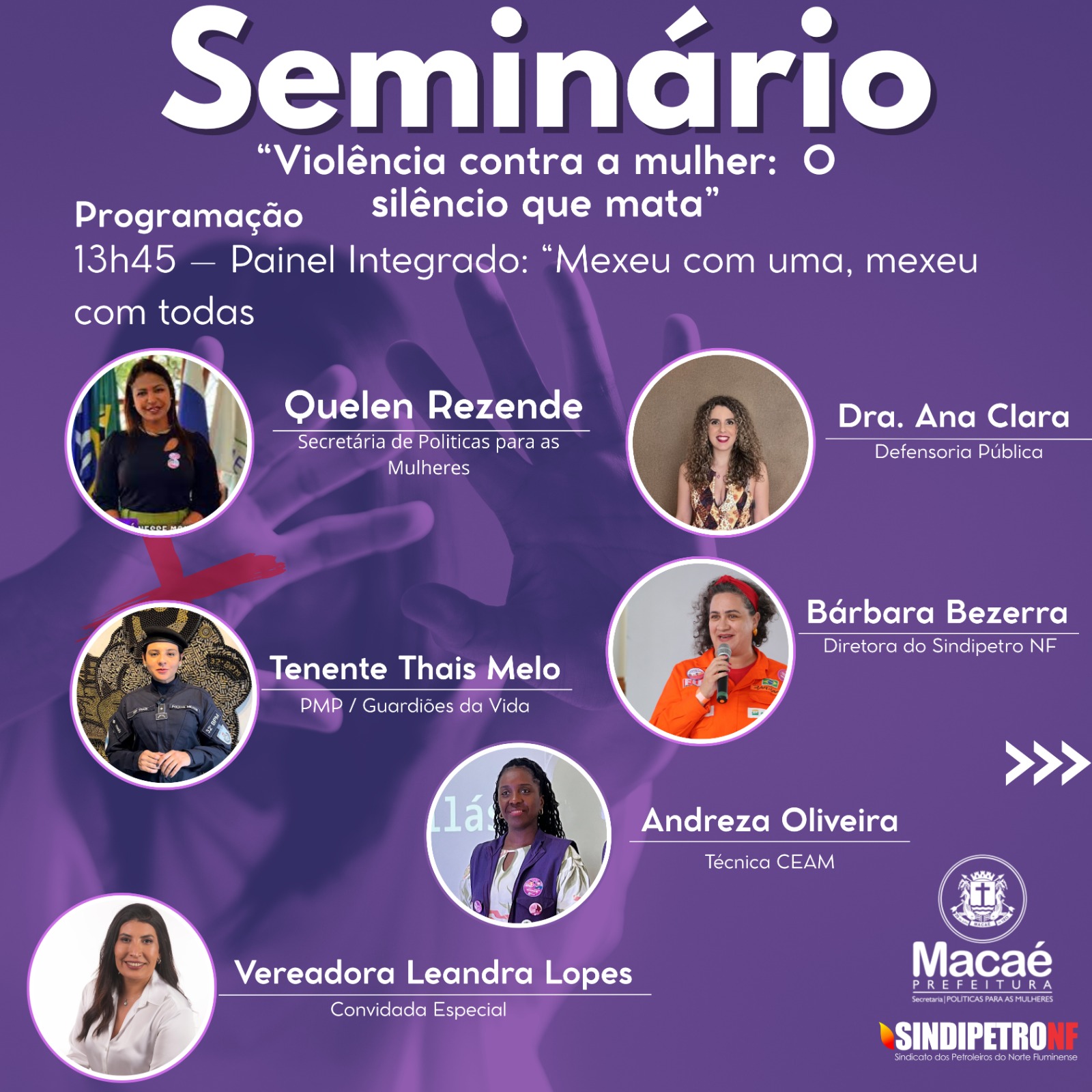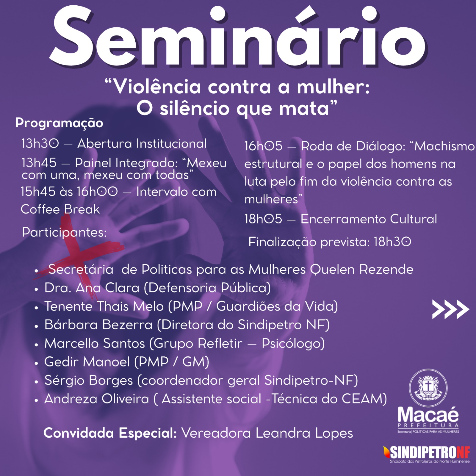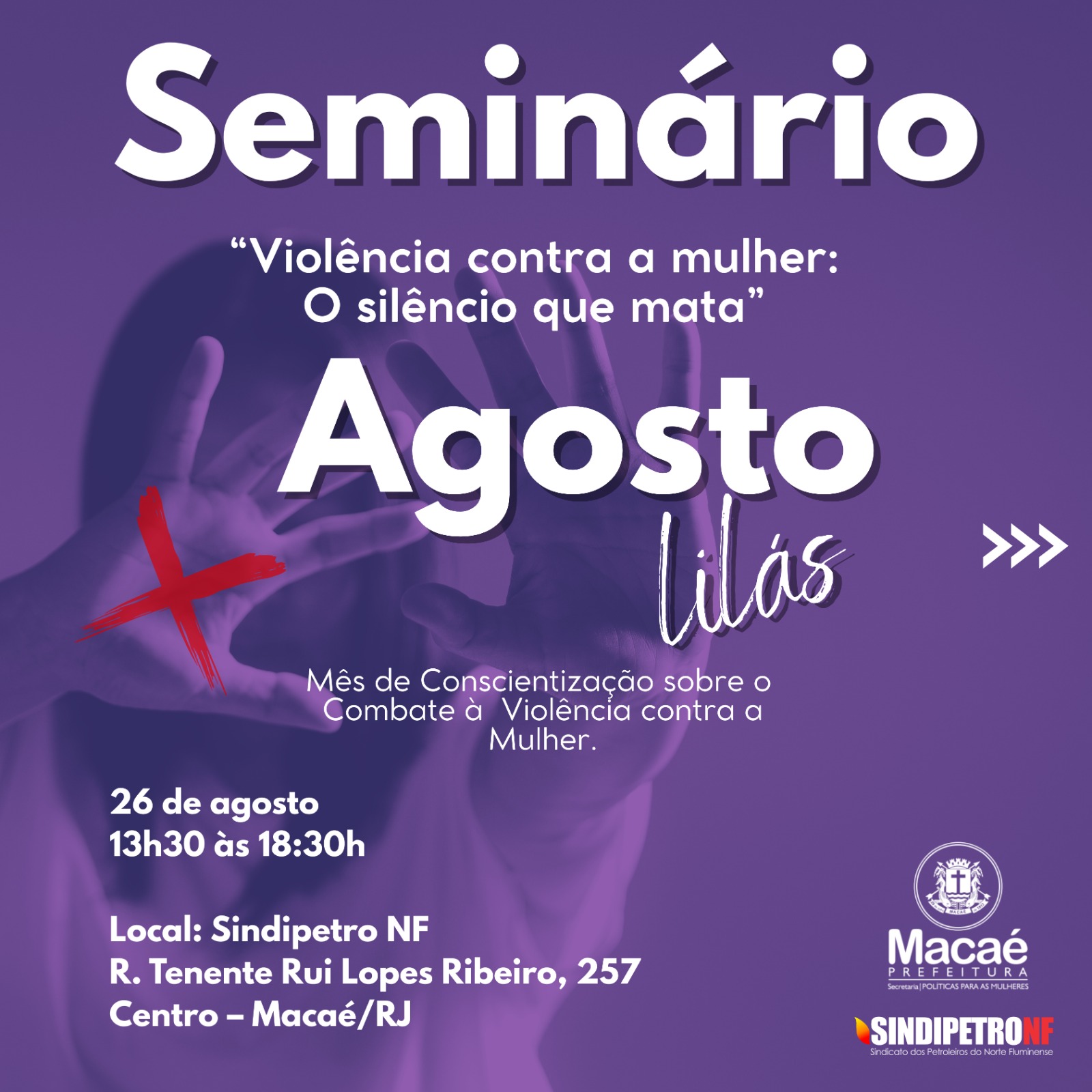 O Teatro do Sindipetro-NF, em Macaé, recebe na próxima terça-feira (26), a partir das 13h30, o Seminário Violência contra a mulher: o silêncio que mata, realizado pela entidade e pela Secretaria de Políticas para as Mulheres da Prefeitura de Macaé. O evento integra a programação do Agosto Lilás, no município.