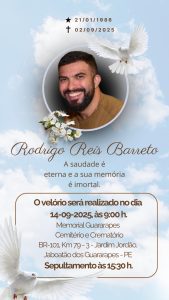 O velório do petroleiro Rodrigo Reis Barreto, falecido em 2 de setembro em um acidente de trabalho na Coréia, será realizado no próximo domingo, 14 de setembro, a partir das 9h, no Memorial Guararapes Cemitério e Crematório, localizado na BR-101, Km 79 – 3, Jardim Jordão, Jaboatão dos Guararapes (PE). O sepultamento está previsto para acontecer às 15h30 do mesmo dia.
